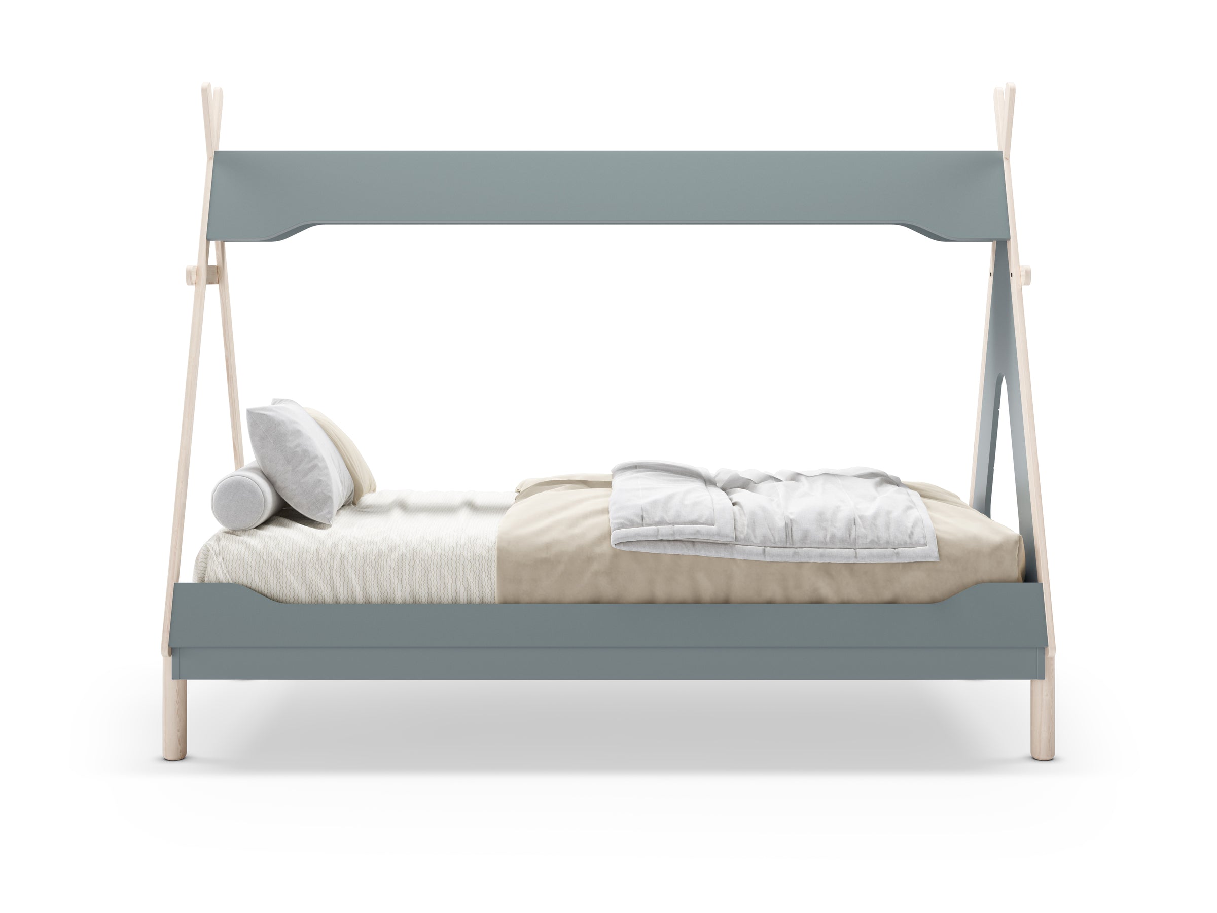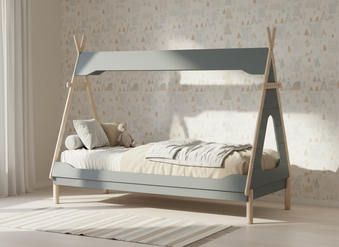 La cabaña Tipi Thalia ofrece un refugio único en color verde petróleo y cera, con una práctica ventana que aporta luminosidad y ventilación.