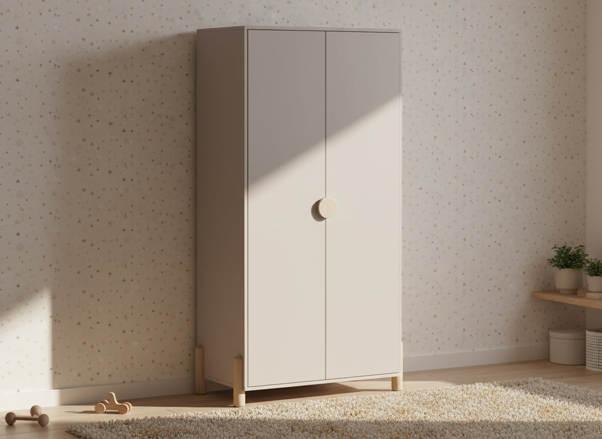 Este armario Peter de dos puertas combina DM y madera de pino, ofreciendo durabilidad y un estilo natural.