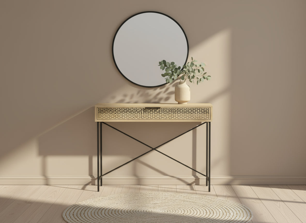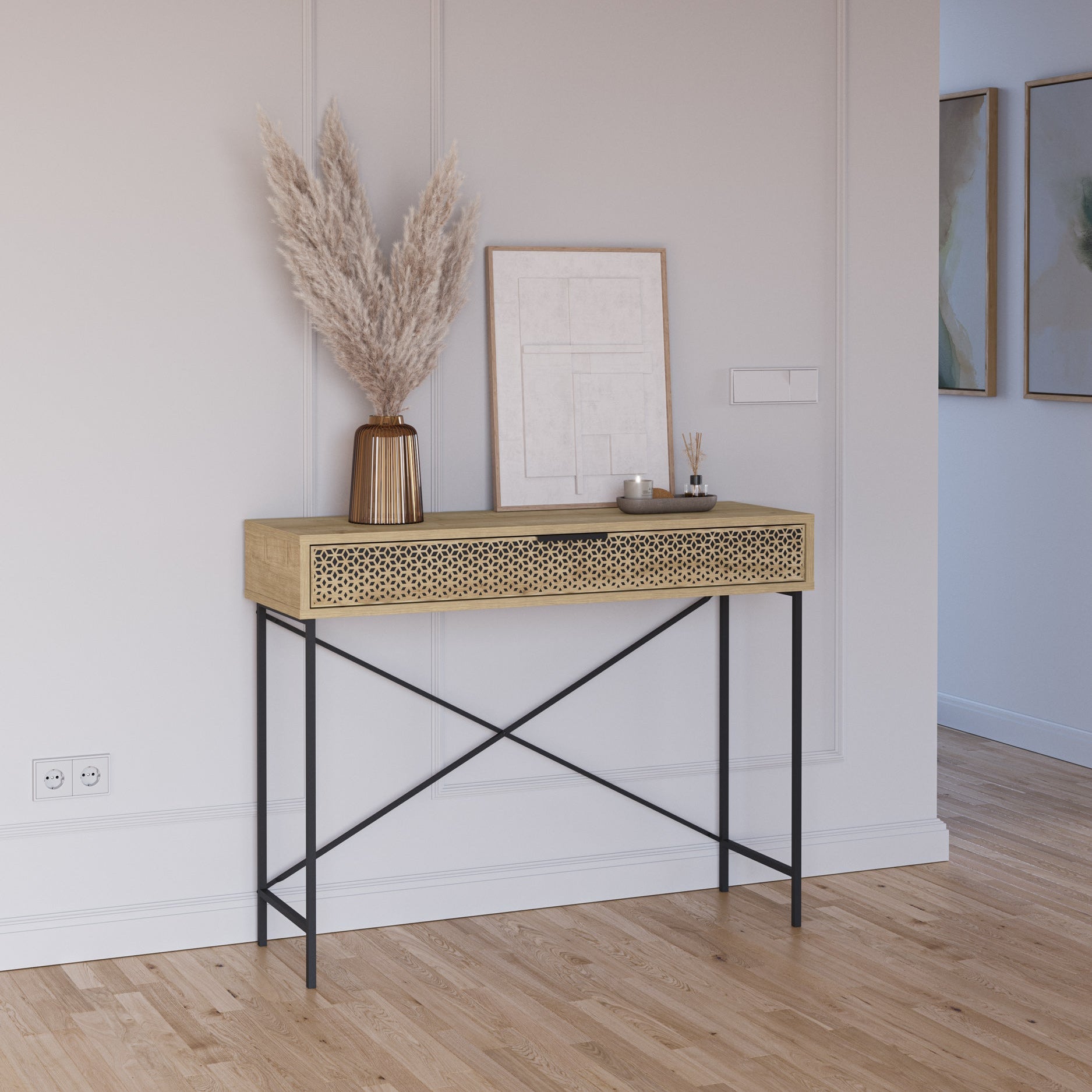 Consola de diseño contemporáneo con un cajón funcional y estructura de patas metálicas.