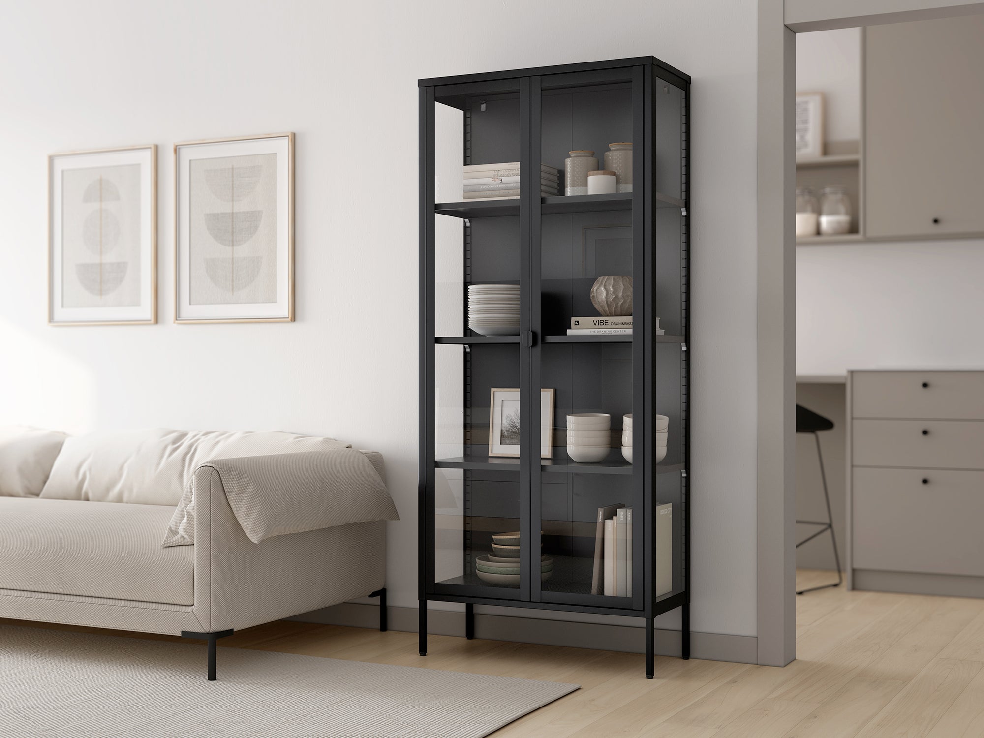 Vitrina 2 puertas con estructura de metal y puertas de cristal. Patas metálicas y estantes móviles.