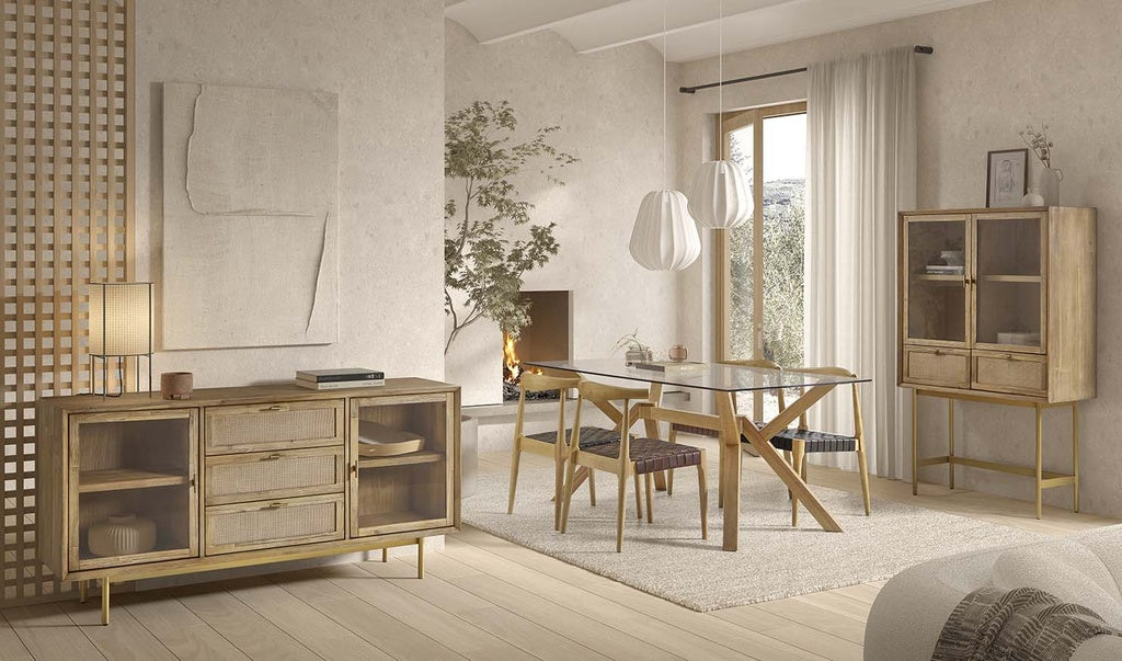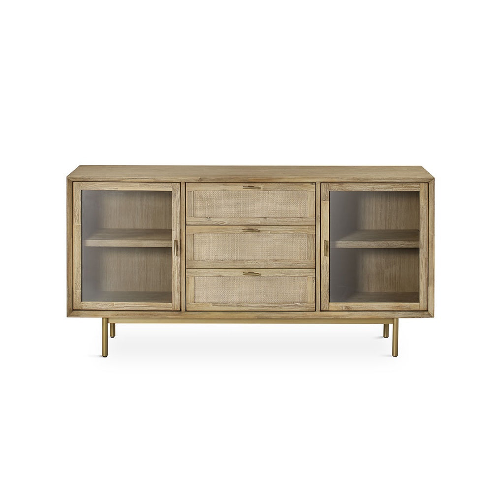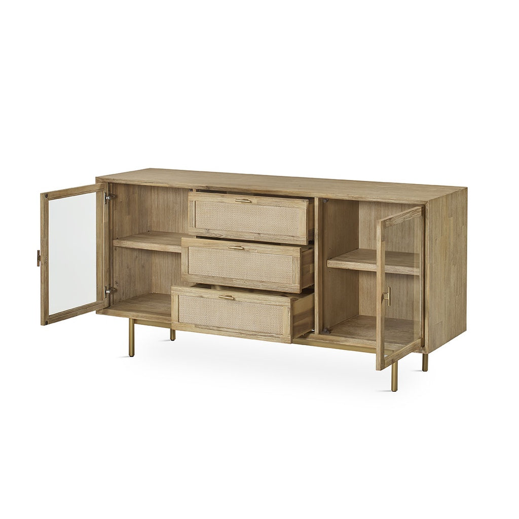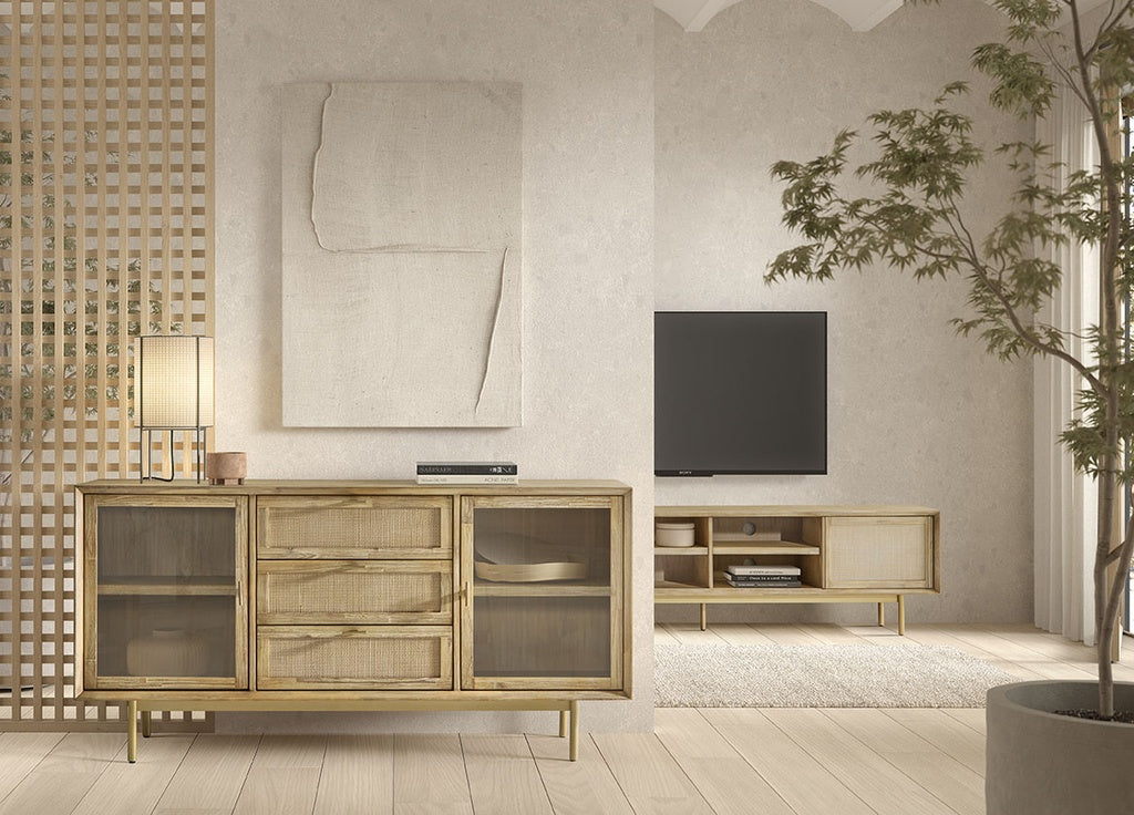 Aparador de 160cm cm en madera natural con pata metálica color dorado, consta de dos puertas de rejilla. Y cajeado para cables.
