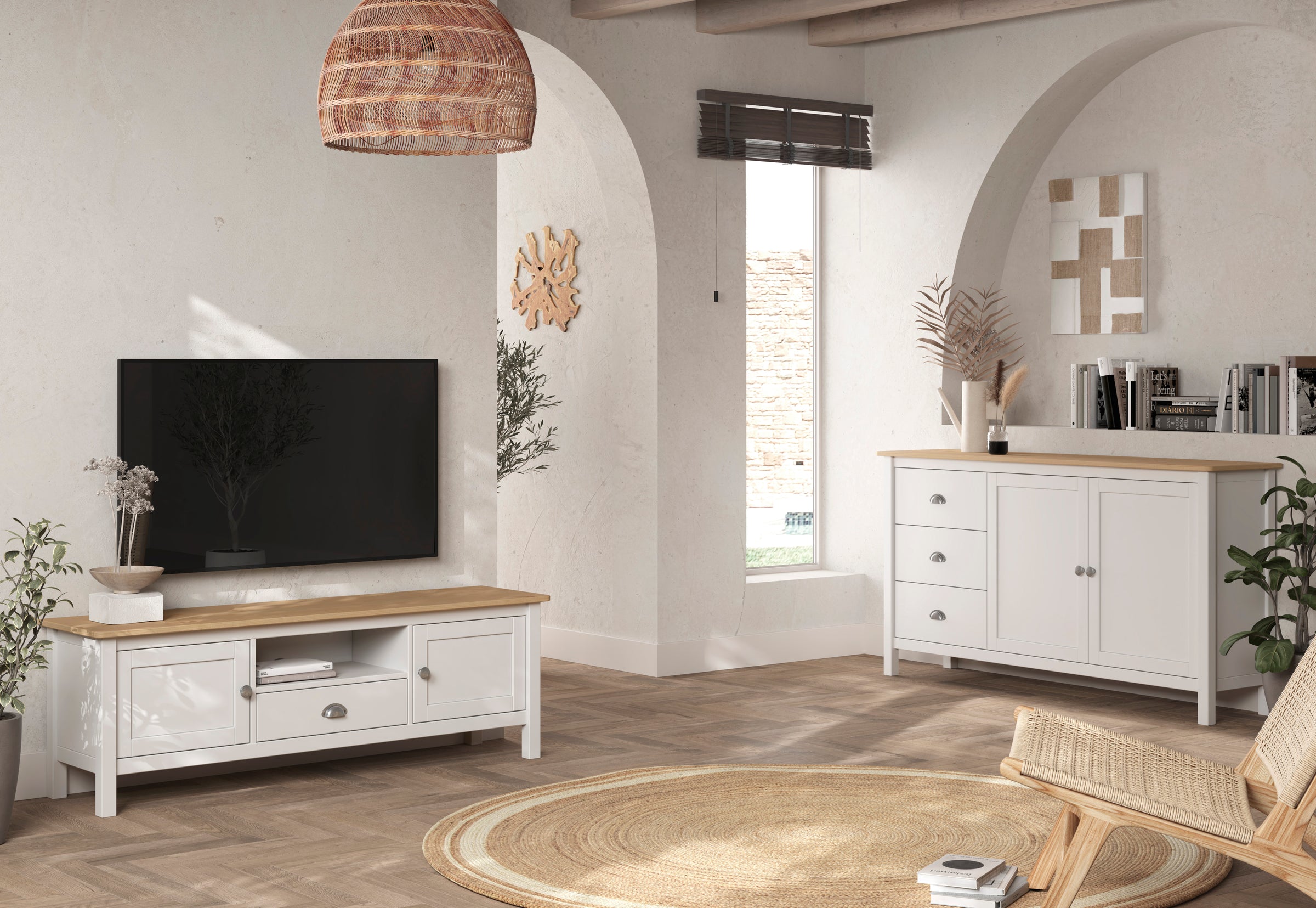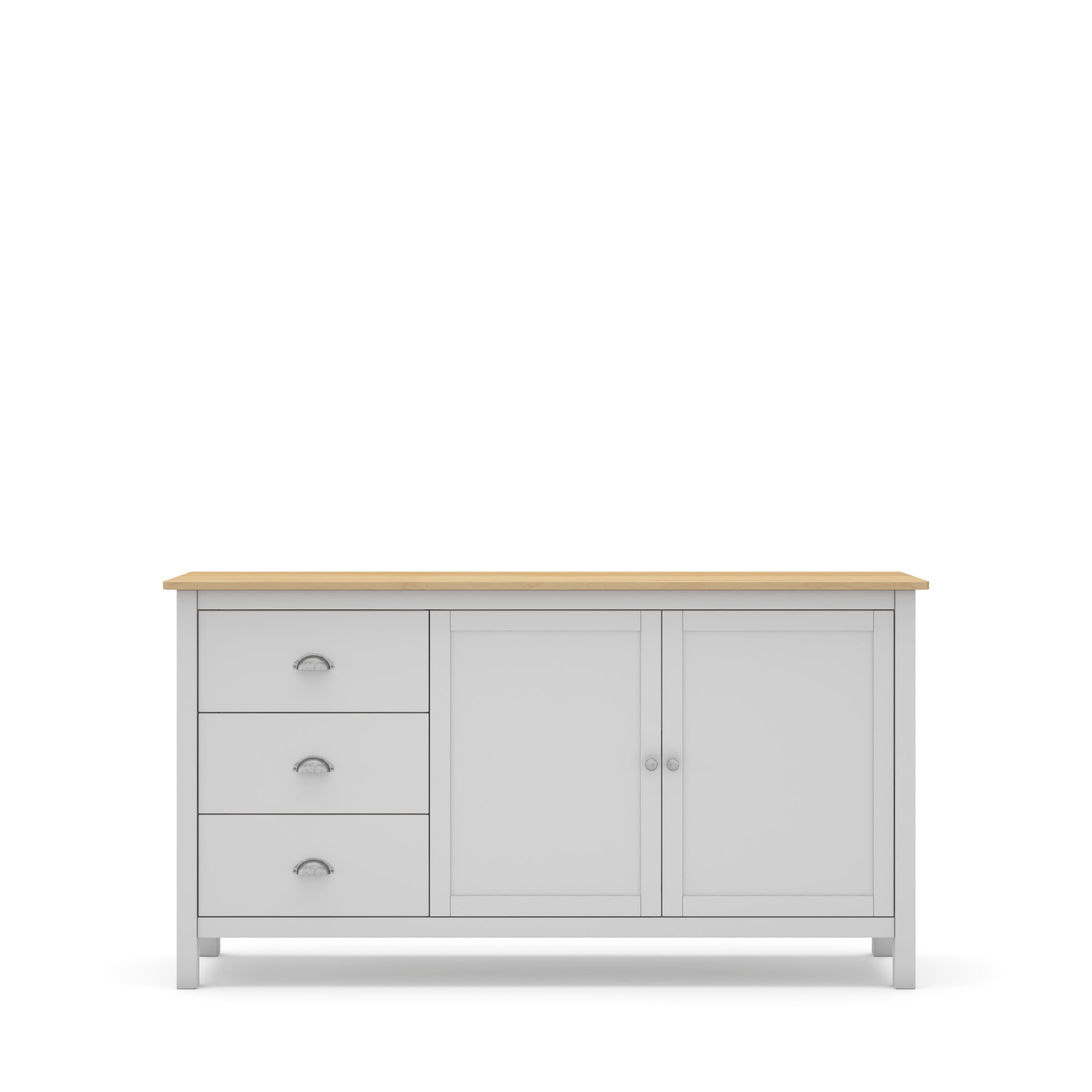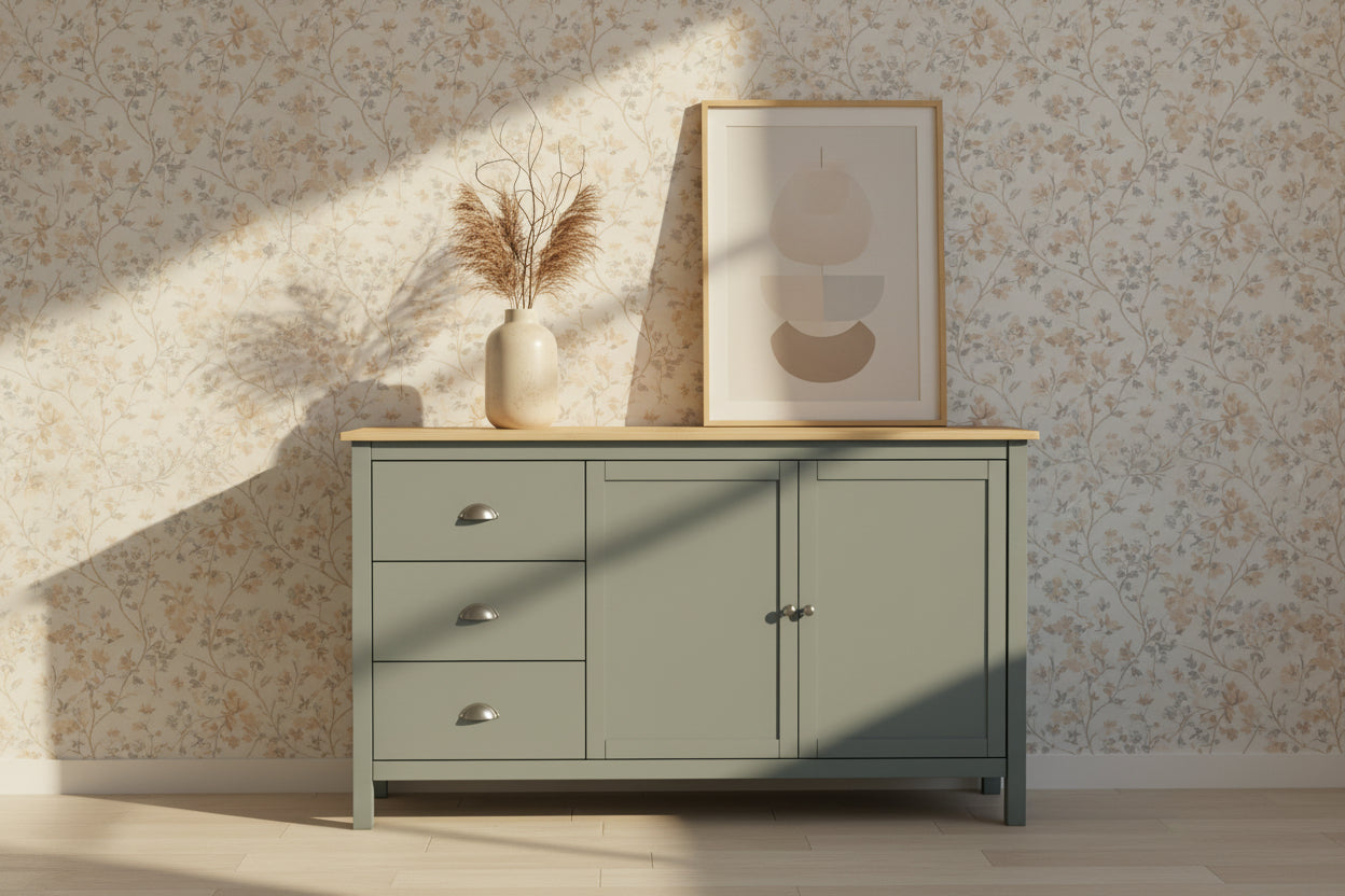 El Aparador Lady es una pieza de mobiliario versátil fabricada en pino macizo, disponible en tonos verde o blanco con encimera de madera natural.