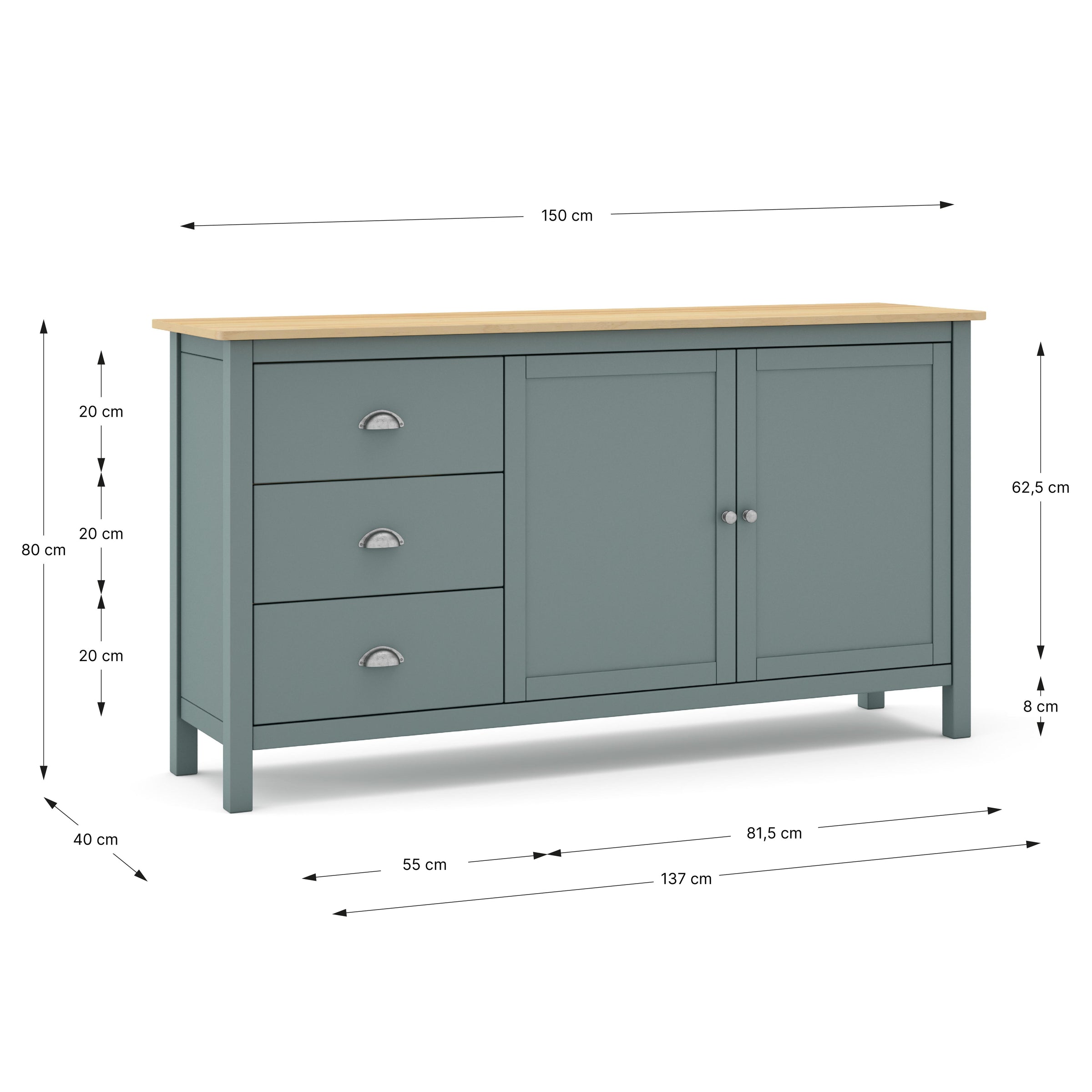 Cuenta con dos puertas y dos cajones funcionales que ofrecen un amplio espacio de almacenamiento. Sus dimensiones de 150 cm de largo, 40 cm de profundidad y 80 cm de altura lo hacen ideal para salones y comedores.