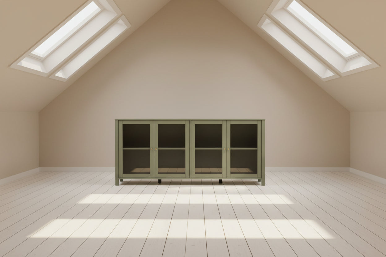 El Aparador Lirenne es una pieza de mobiliario versátil fabricada en pino macizo, diseñada para maximizar el almacenamiento en espacios de comedor o sala de estar.