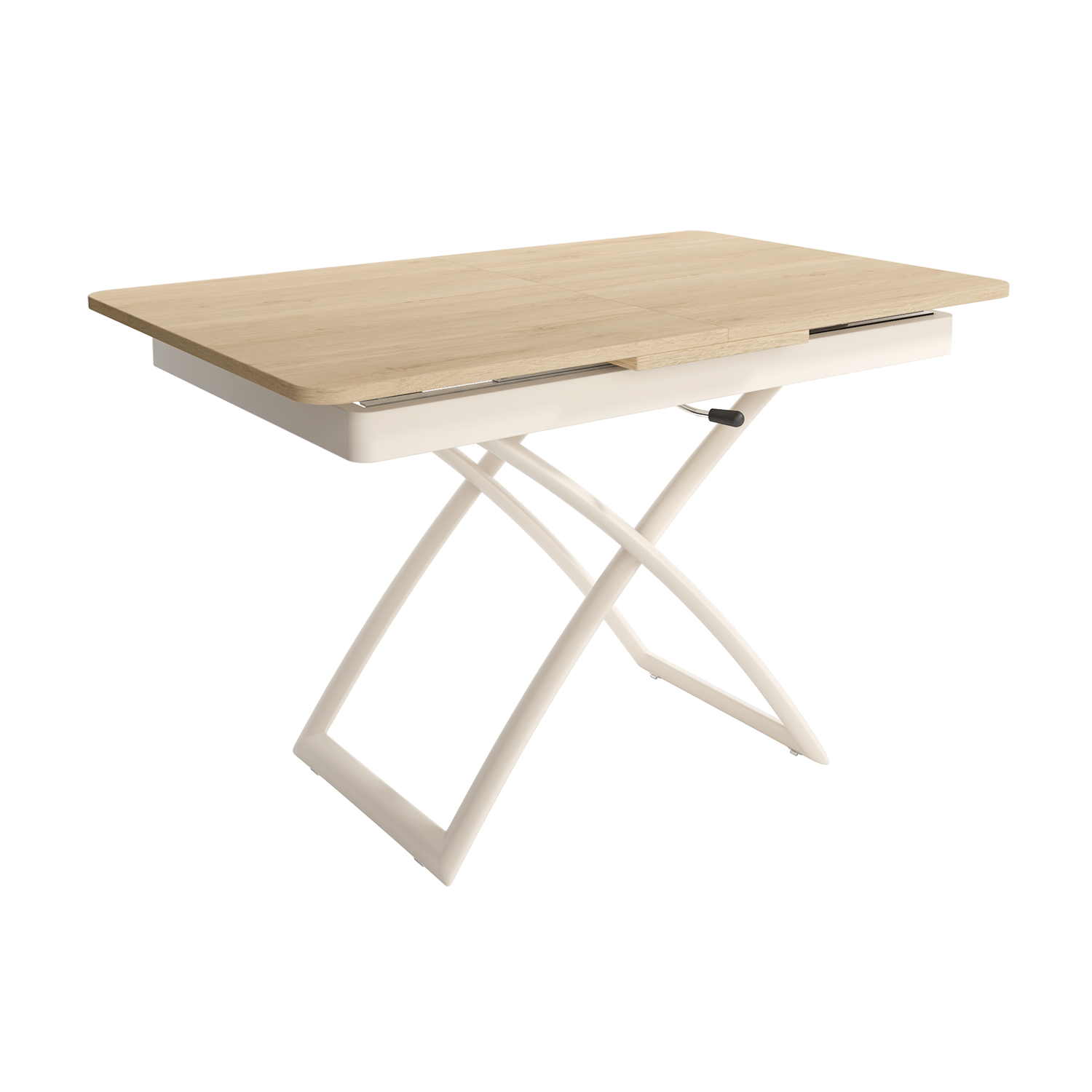 Sistema elevable de manual y extensible que transforma tu mesa según el momento: baja para café, sube para comer, se expande cuando la necesitas.