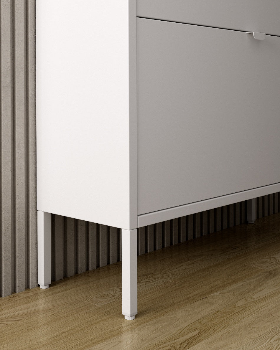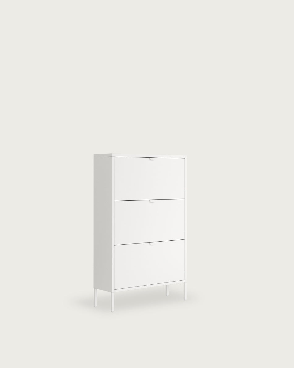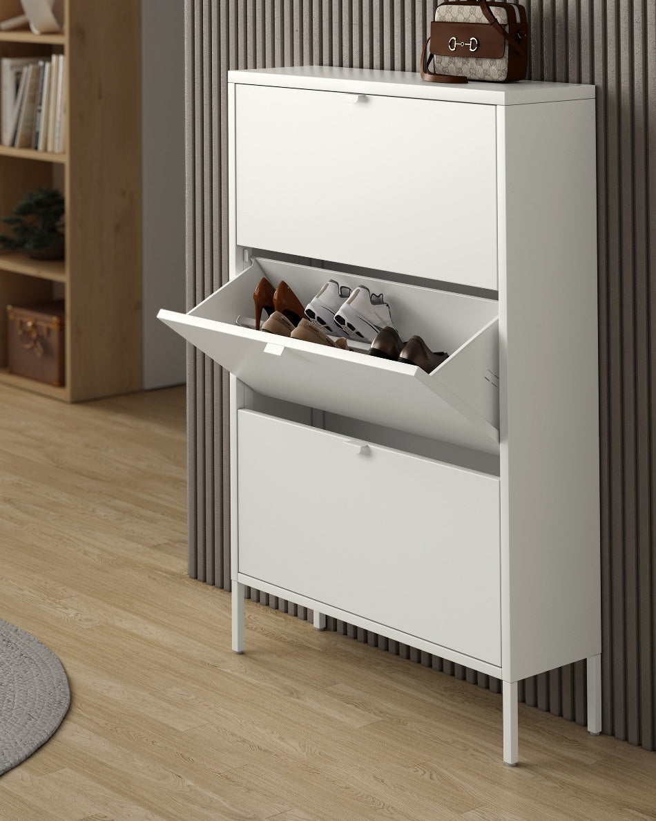 Zapatero vertical de estructura metálica con acabado lacado en crema y tres puertas de acceso.