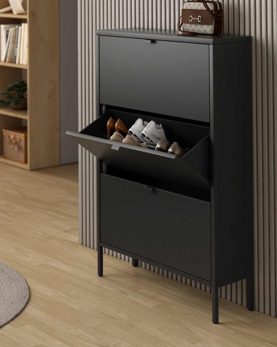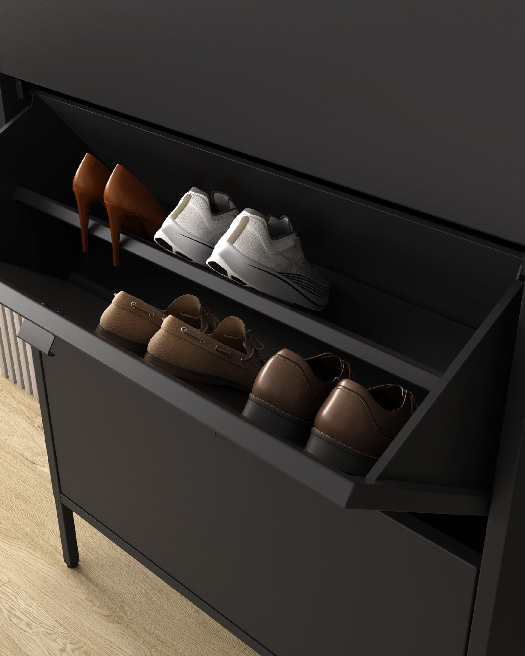 Diseño compacto y funcional que optimiza el espacio vertical, perfecto para organizar calzado manteniendo una estética ordenada y sofisticada.