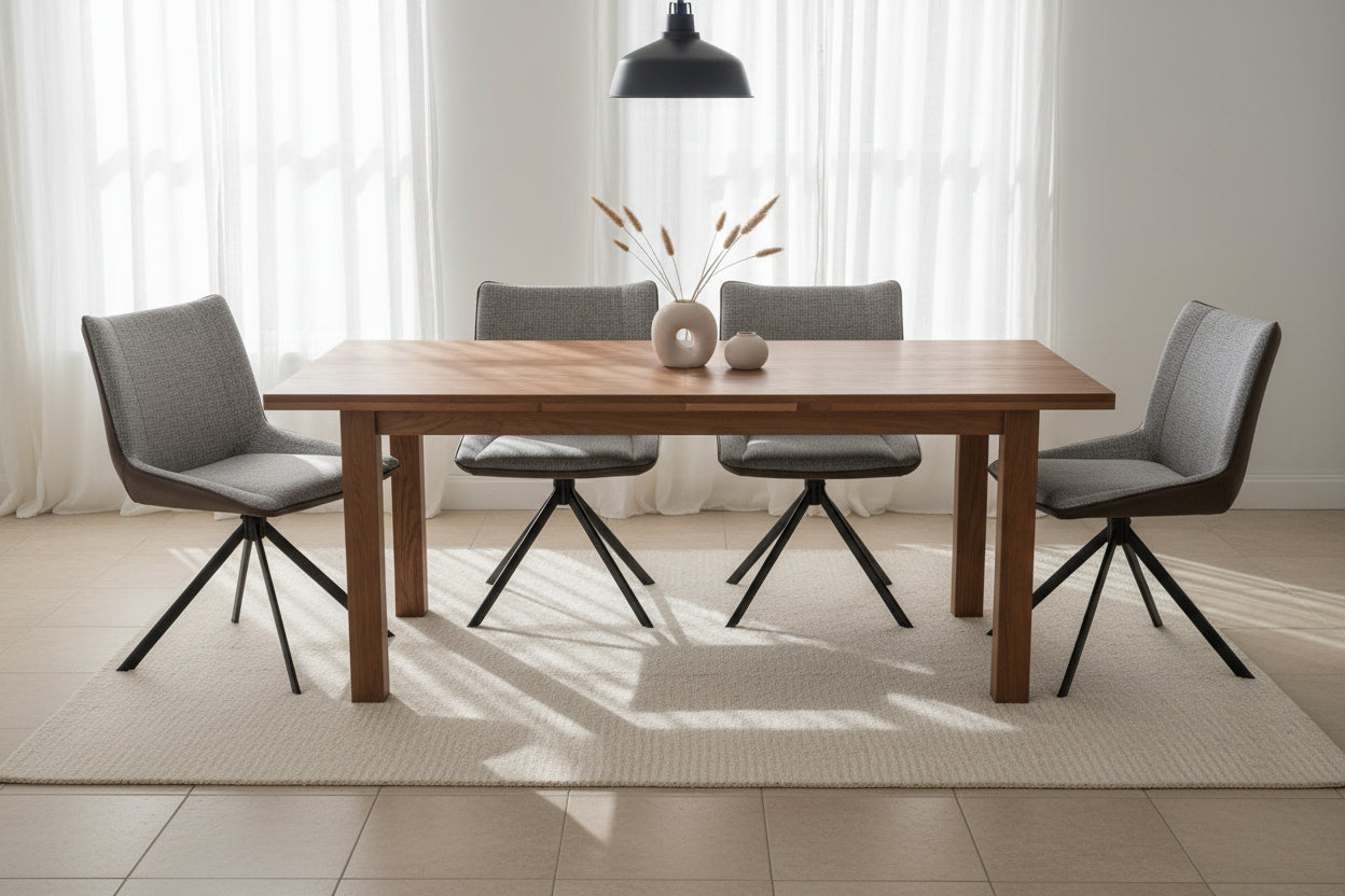 La silla Diente combina su asiento y respaldo tapizados en un tejido texturizado con una capa exterior que simula antelina, proporcionando una textura suave y agradable al tacto.