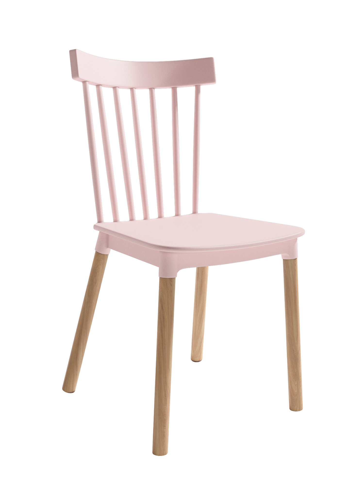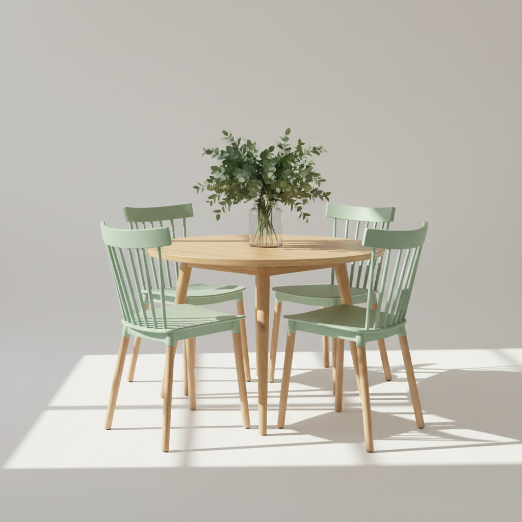 Conjunto de cuatro sillas versátiles fabricadas en polipropileno resistente con estructura de patas en madera maciza.