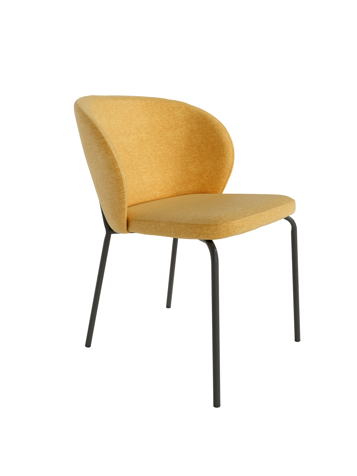 Su tapizado en tonalidad mostaza aporta calidez y sofisticación a espacios contemporáneos, mientras que la estructura de patas metálicas negras garantiza estabilidad y longevidad.