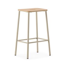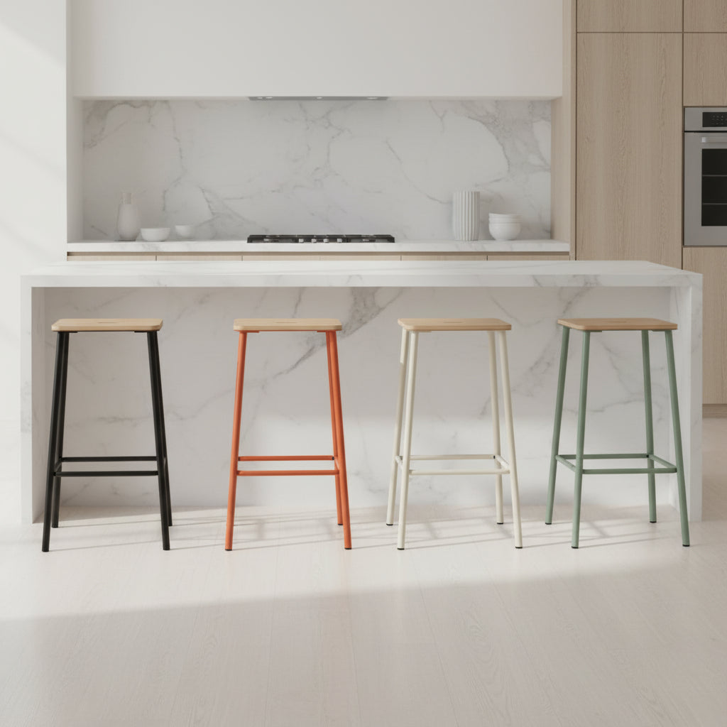 Taburete versátil de diseño minimalista que combina una estructura metálica robusta con un asiento de madera en tonalidad natural.