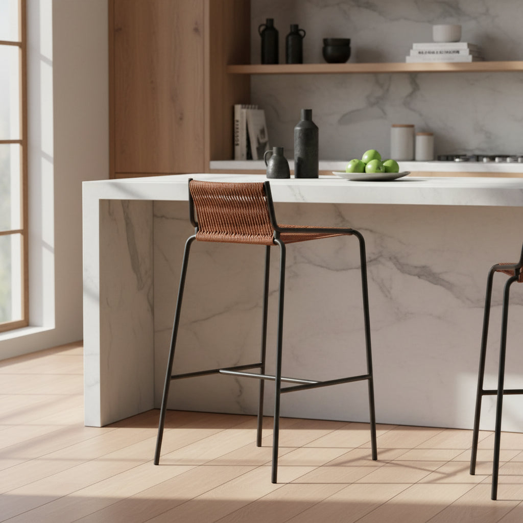 Este taburete combina estructura metálica resistente con tejido de cuero de alta calidad, ofreciendo una solución versátil para espacios modernos.