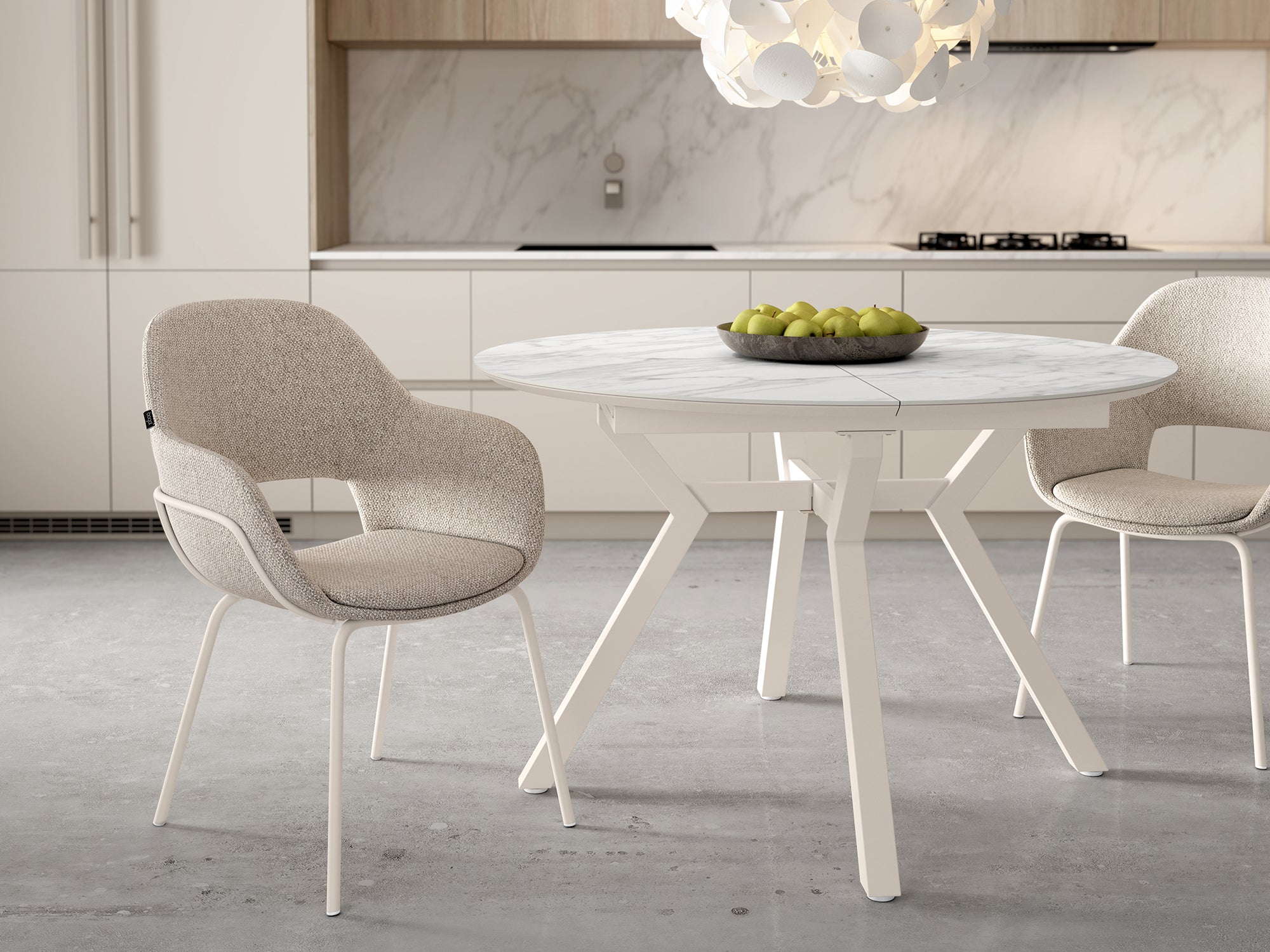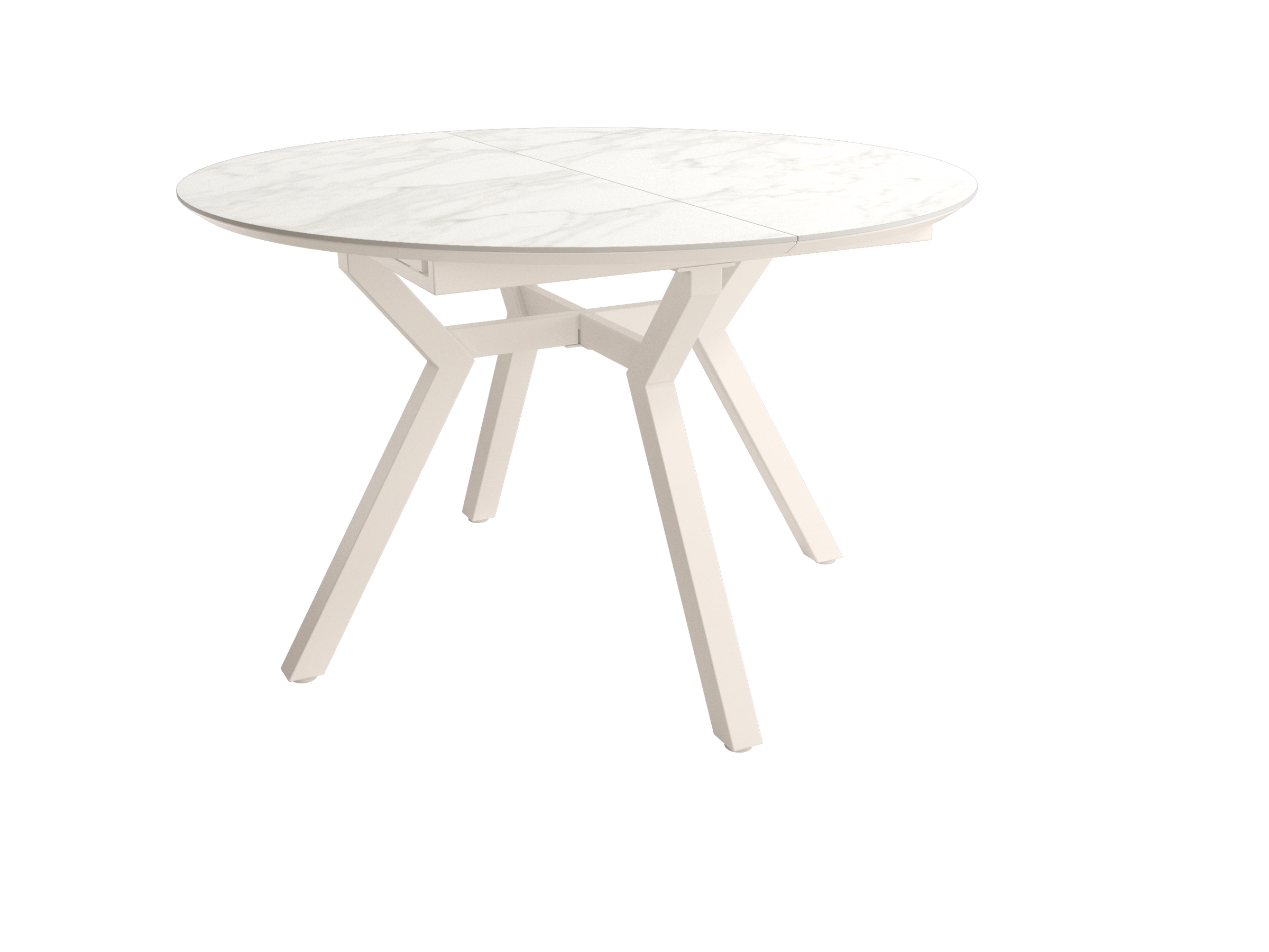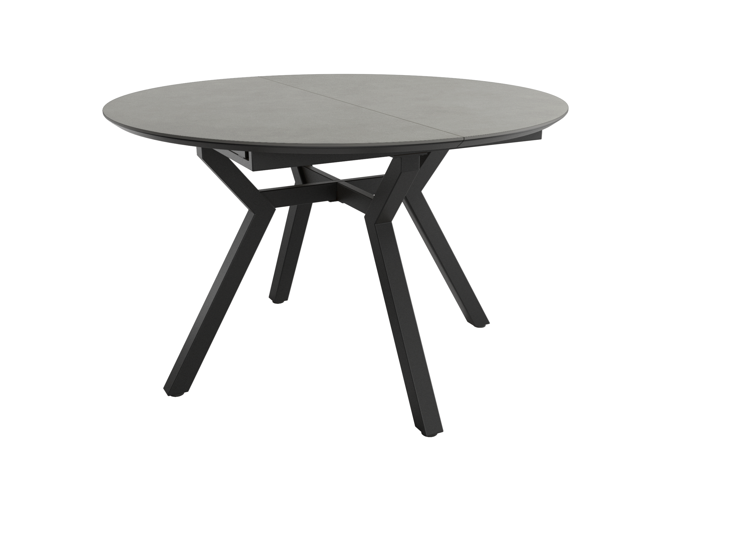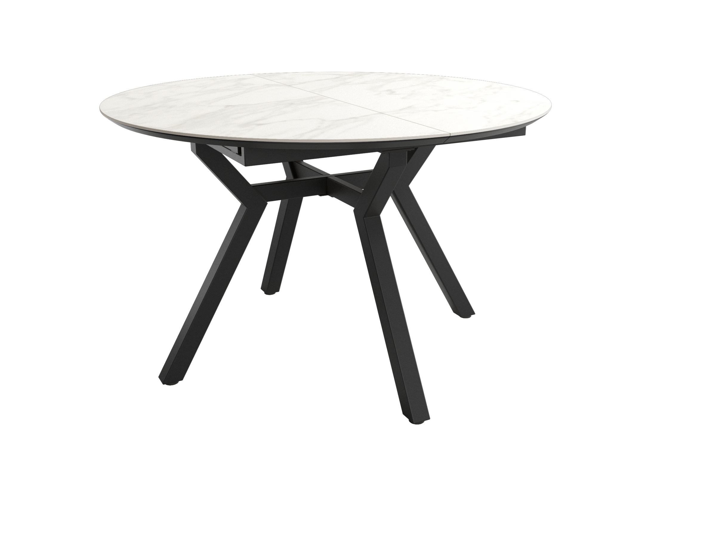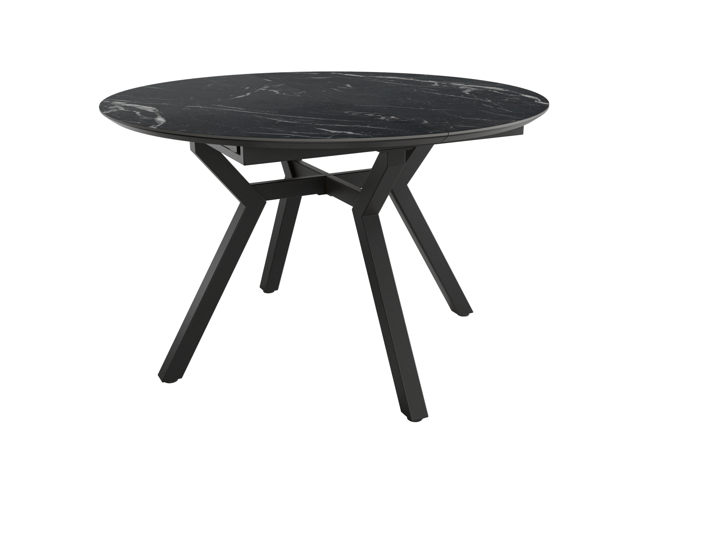 Mesa de comedor extensible que combina funcionalidad y diseño contemporáneo. Estructura metálica negra de gran robustez con tablero de MDF biselado de 25 mm que simula acabado en piedra natural.