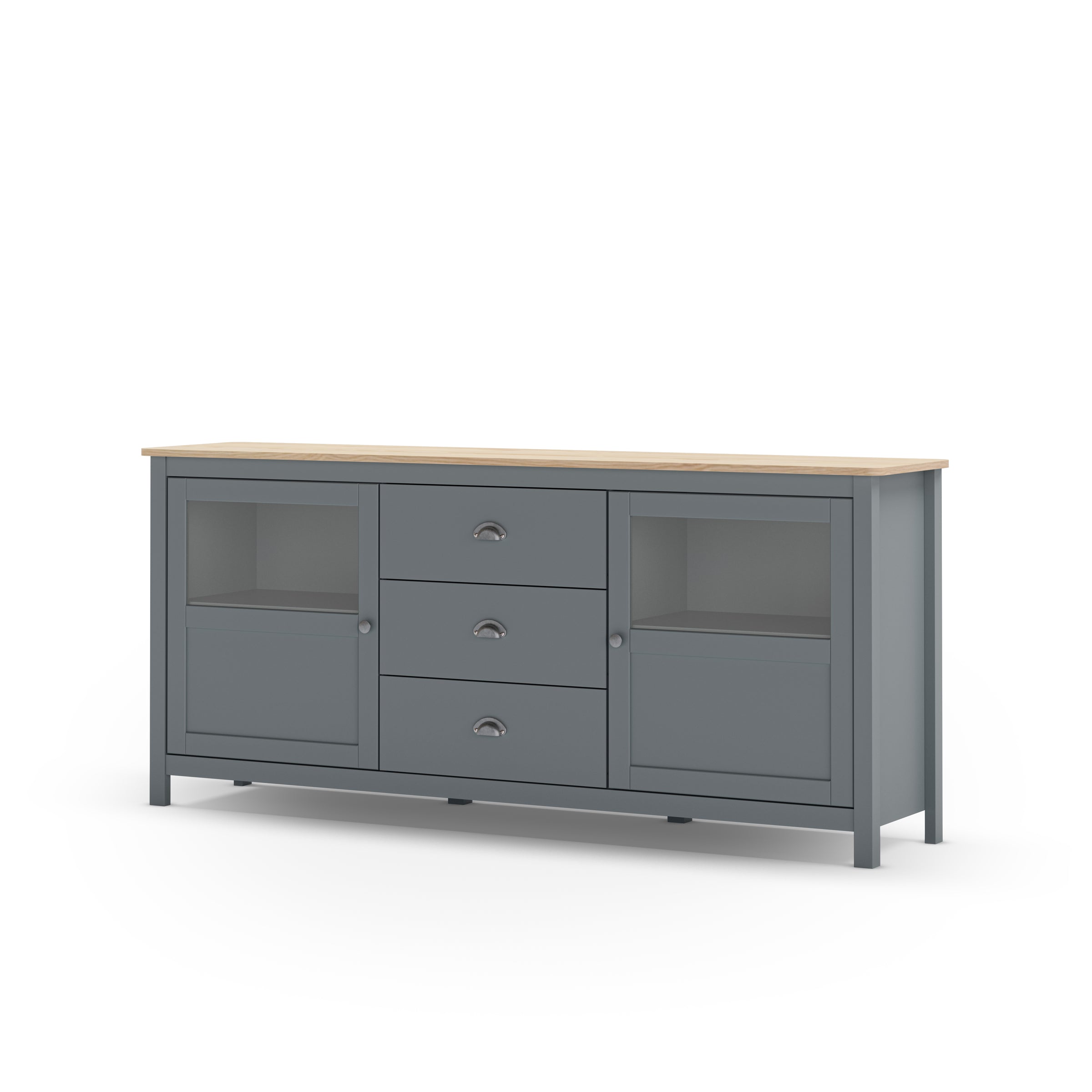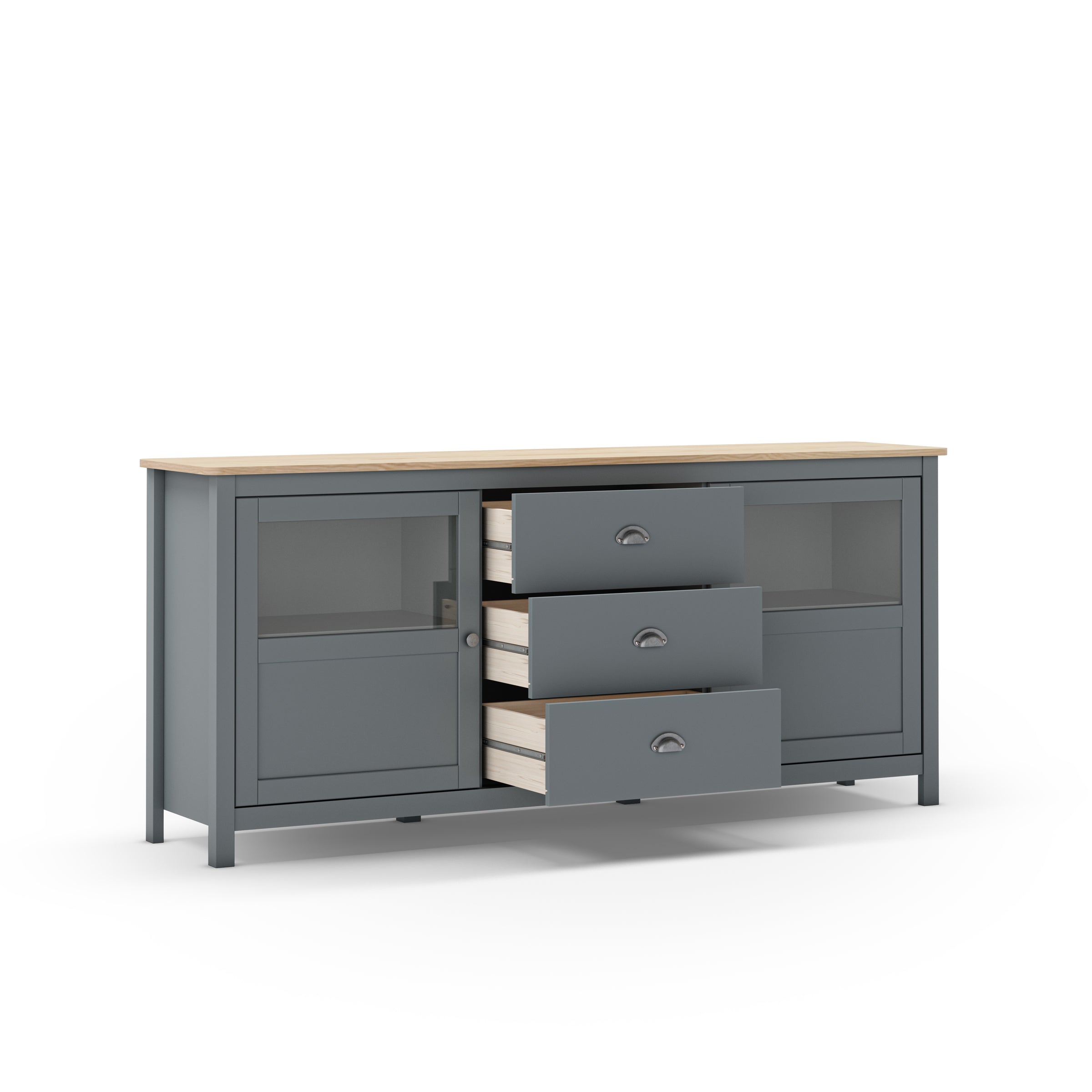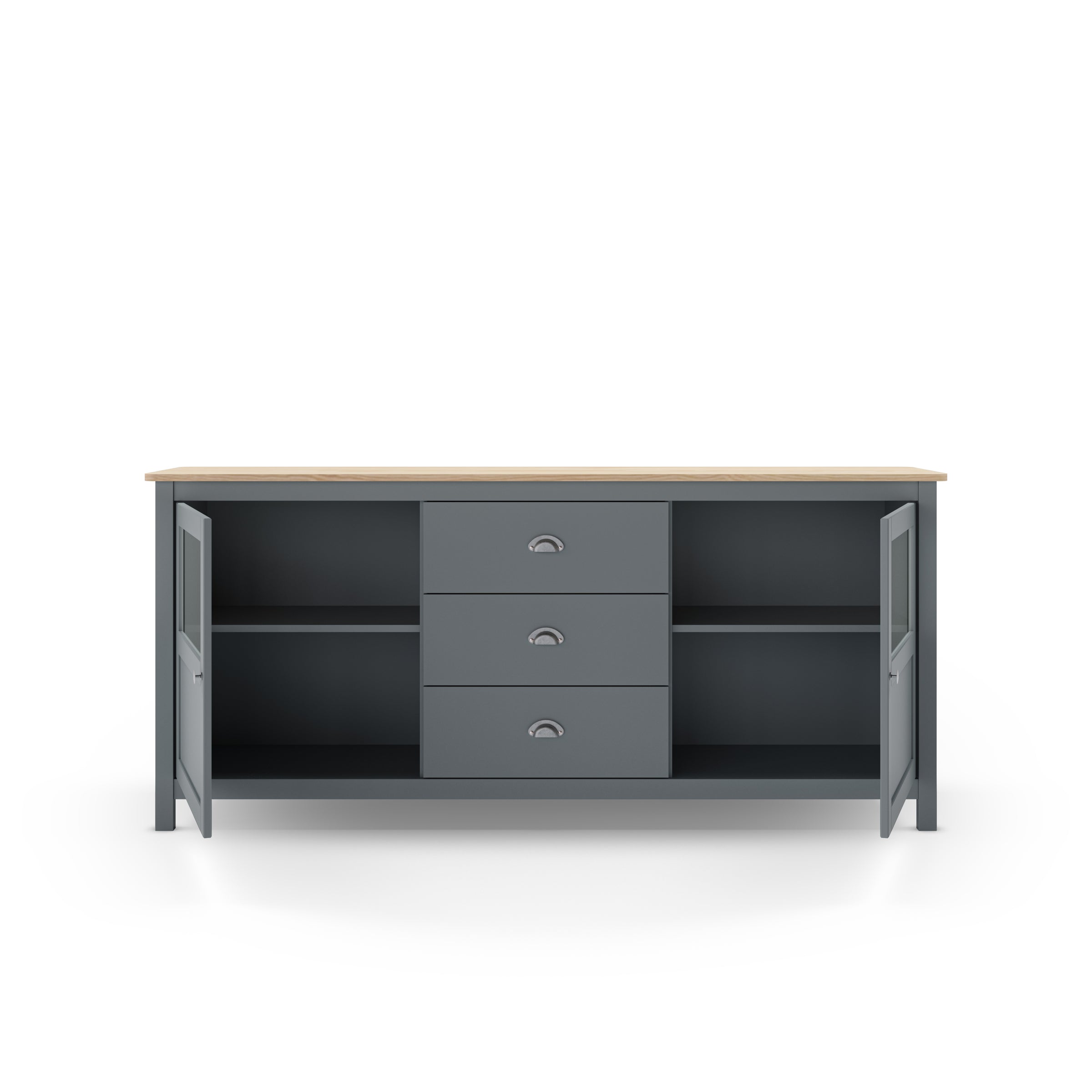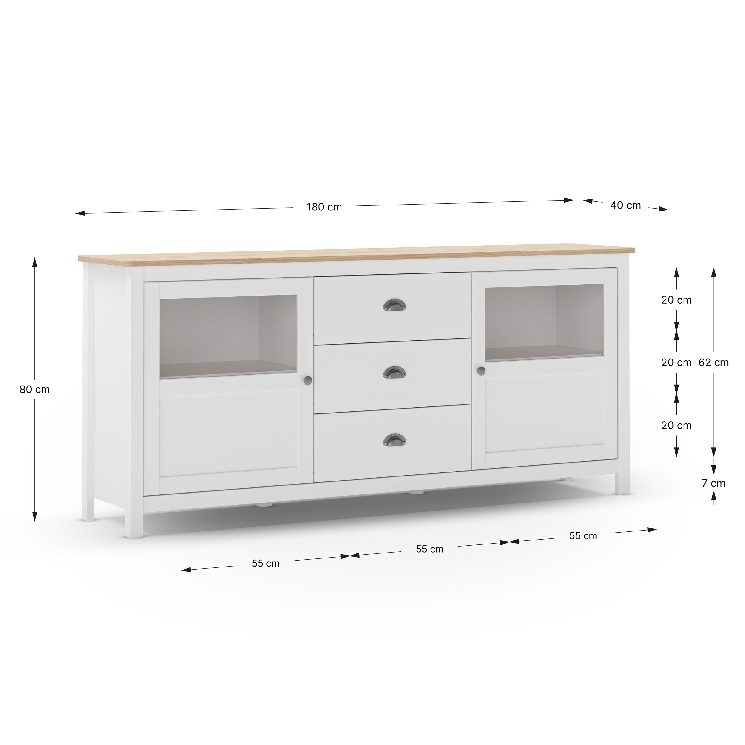 Cuenta con dos puertas y dos cajones funcionales que ofrecen amplio espacio de almacenamiento. Sus dimensiones de 180 cm de largo, 40 cm de profundidad y 80 cm de altura lo hacen ideal para salones y comedores.