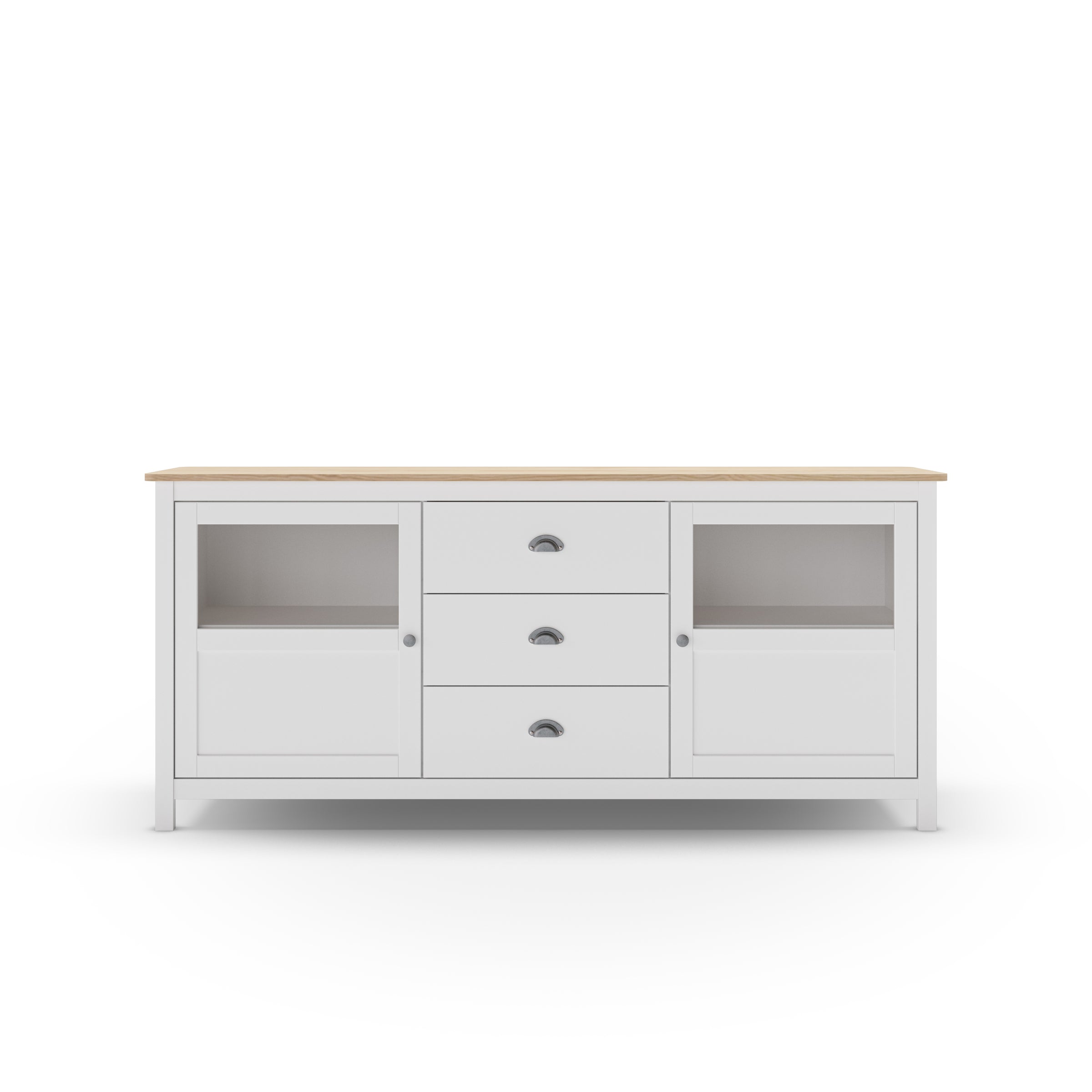 El Aparador Lady es una pieza de mobiliario versátil fabricada en pino macizo, disponible en tonos verde o blanco con encimera de madera natural.