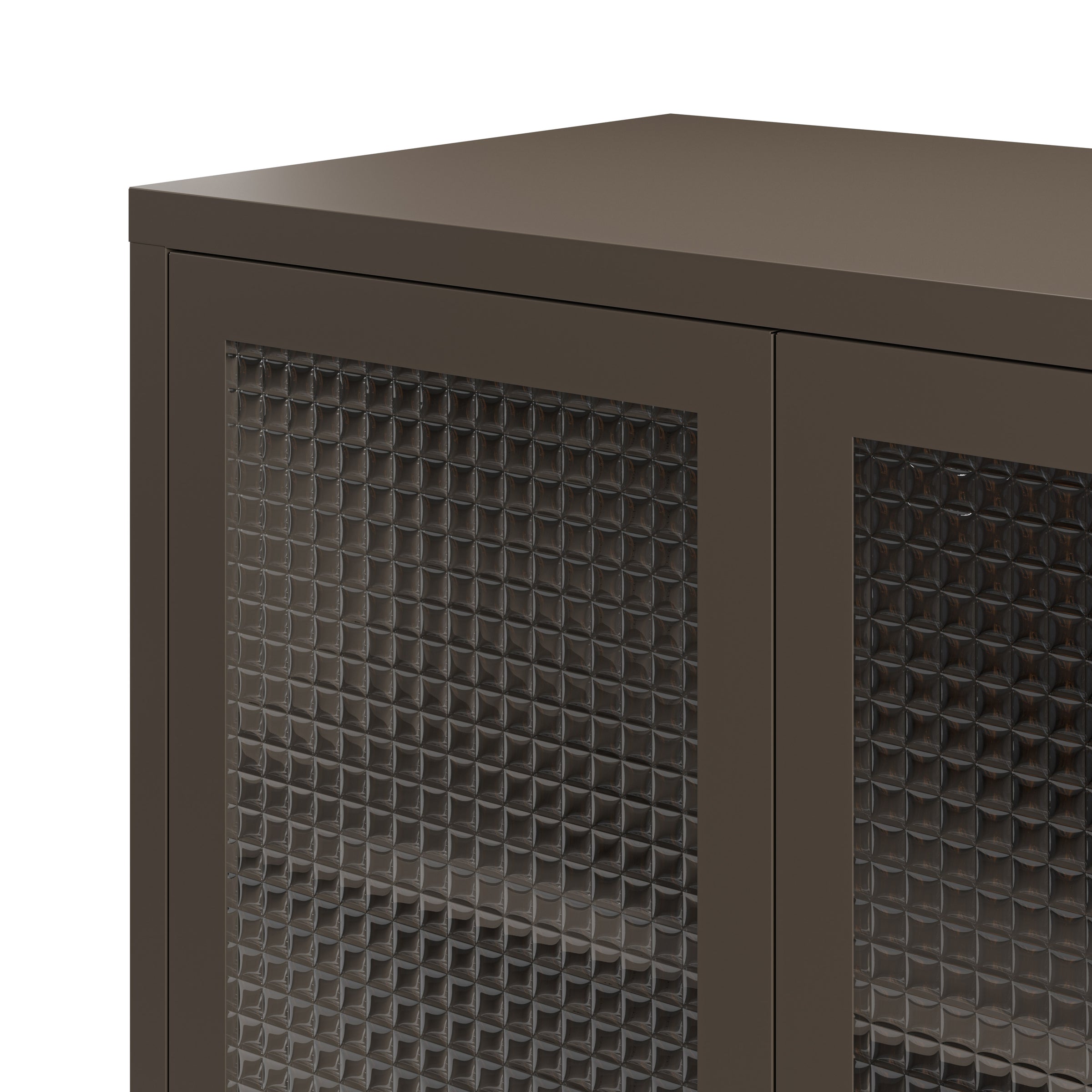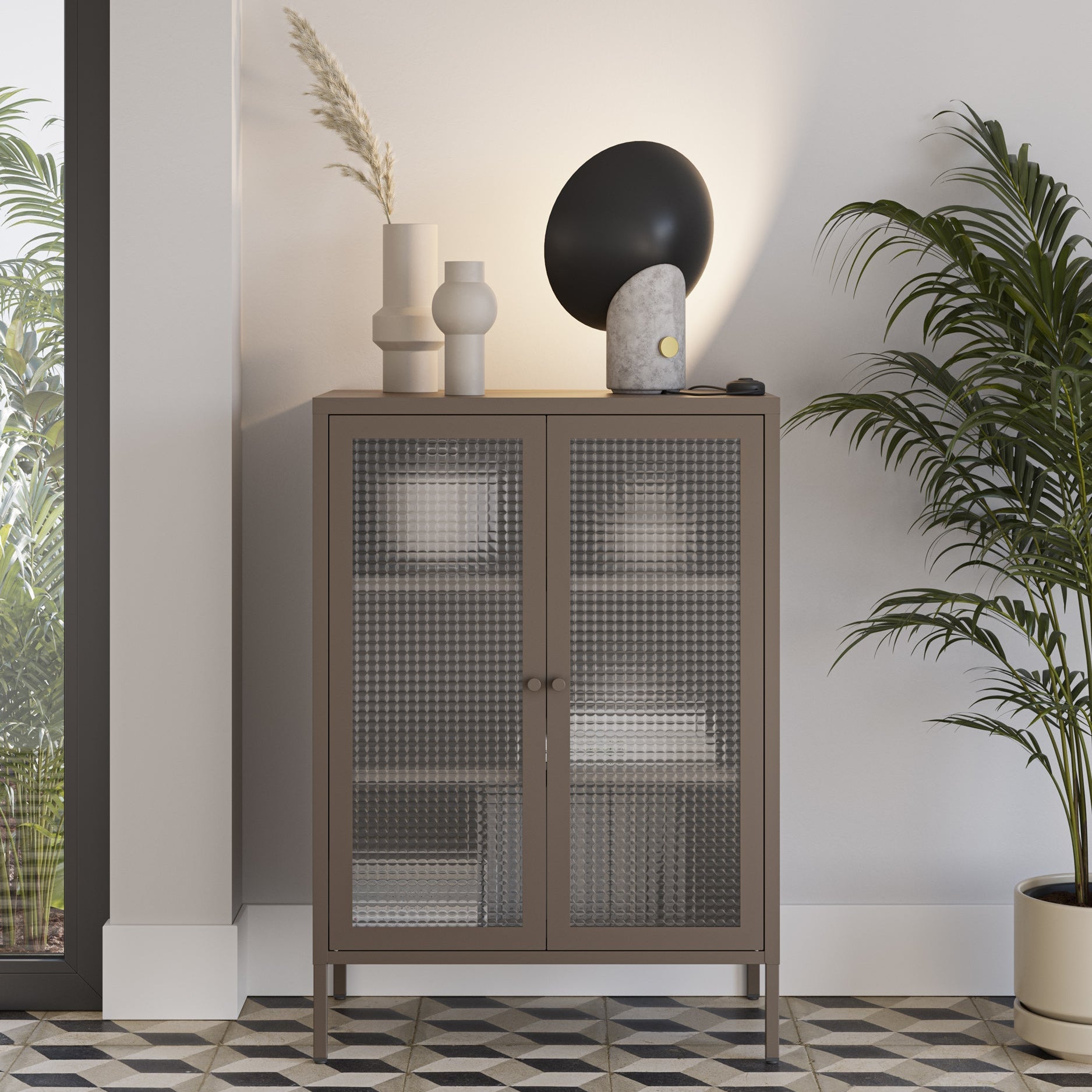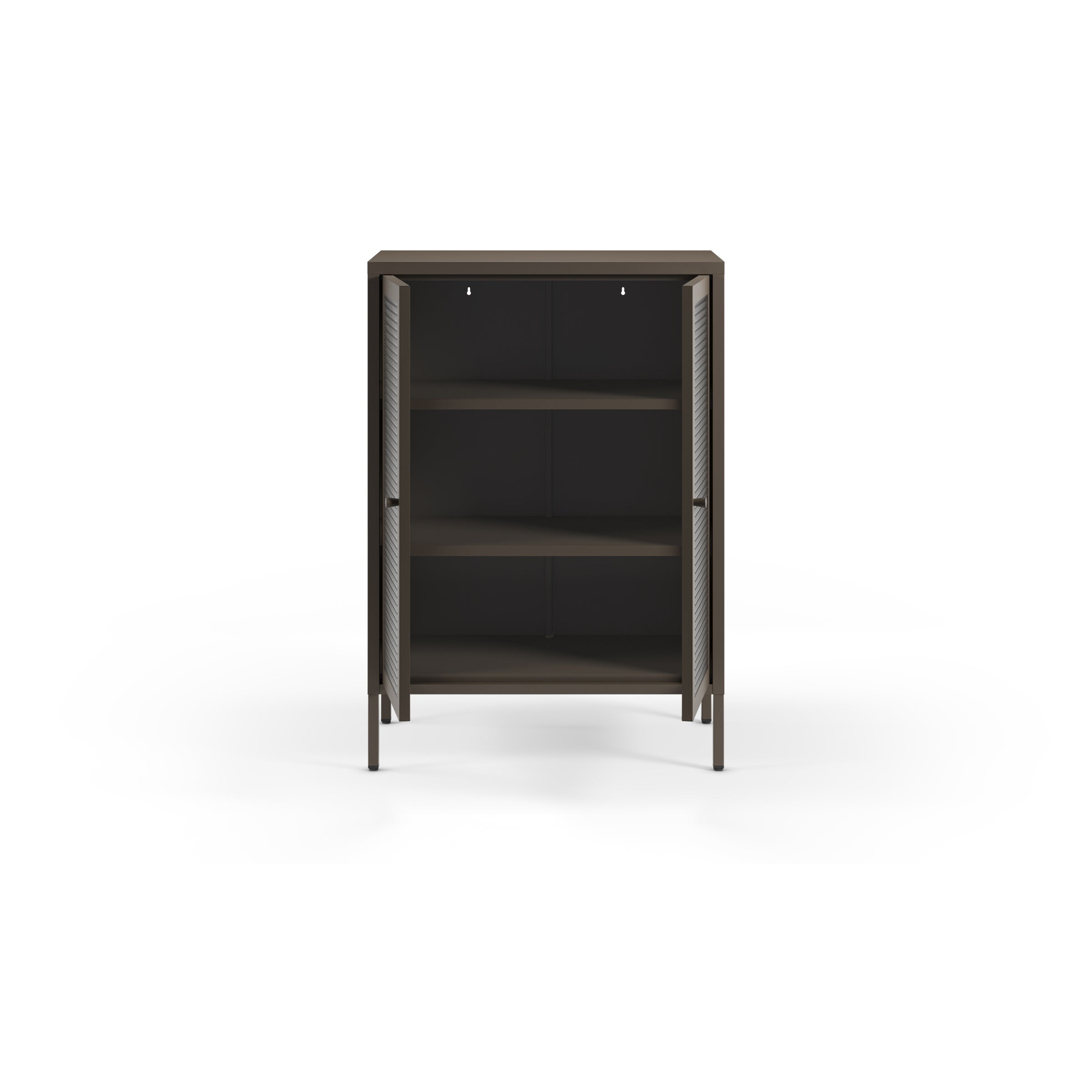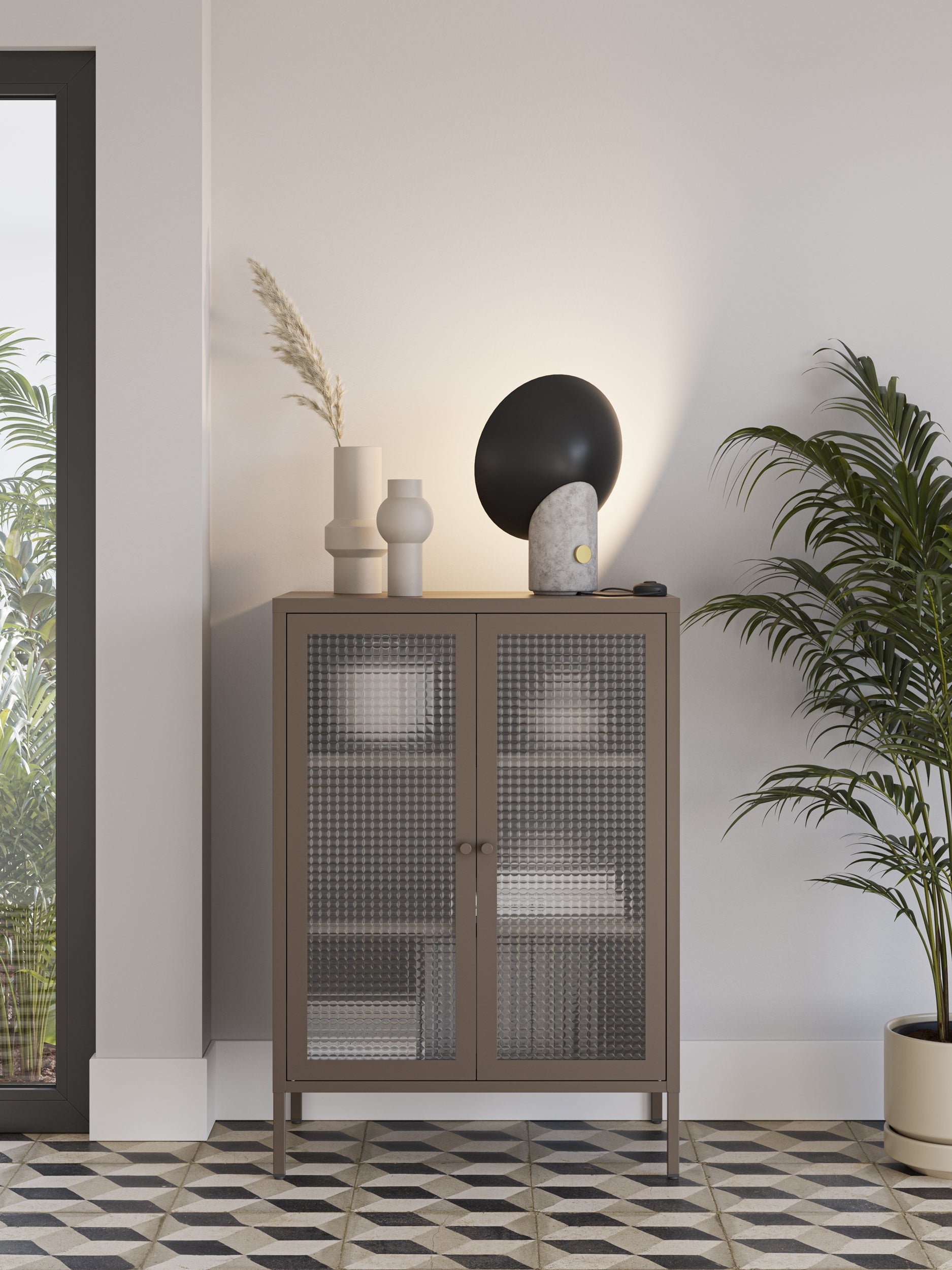 Mueble aparador de dos puertas con marco metálico robusto y paneles de cristal templado de seguridad. Dimensiones: 70 cm de ancho, 100 cm de altura y 40 cm de profundidad, proporcionando almacenamiento elegante sin ocupar excesivo espacio.