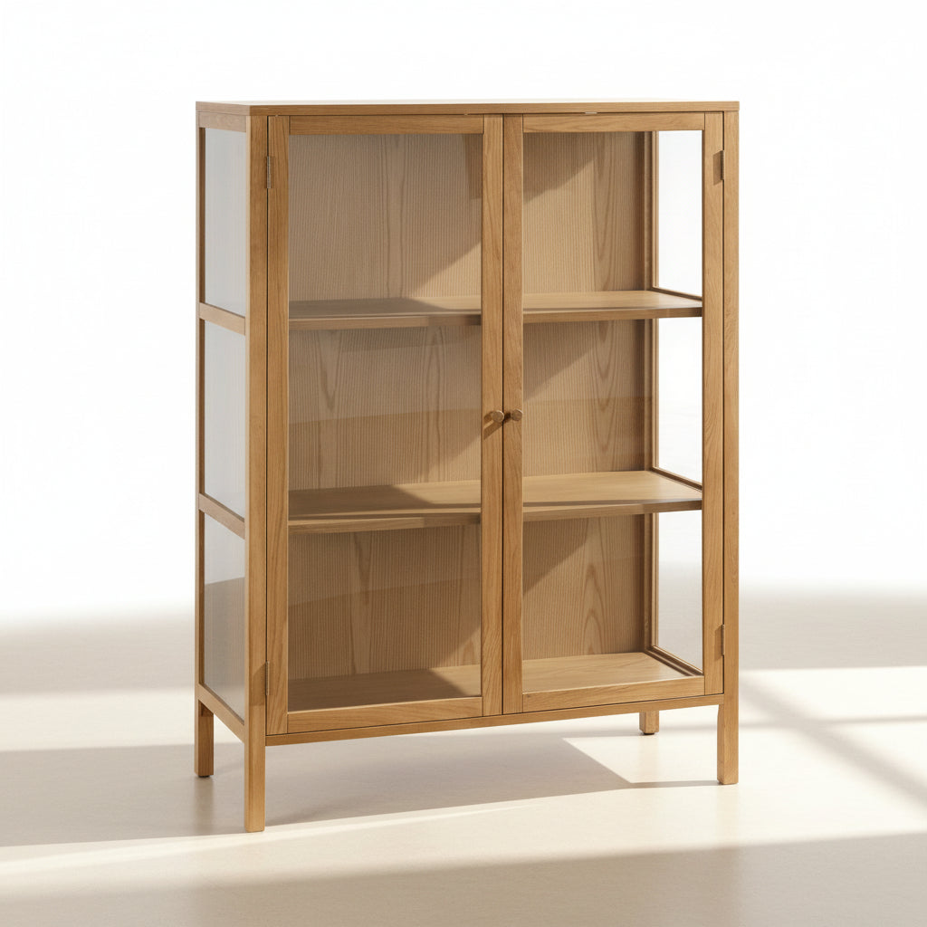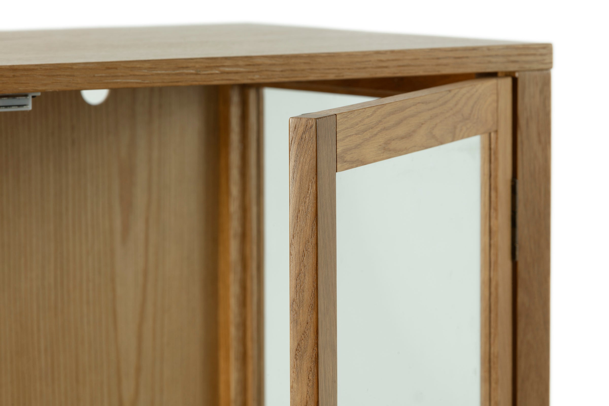 El mueble TV Auxiliar Arvia combina roble natural, cristal y chapado MDF para ofrecer una pieza elegante y funcional.