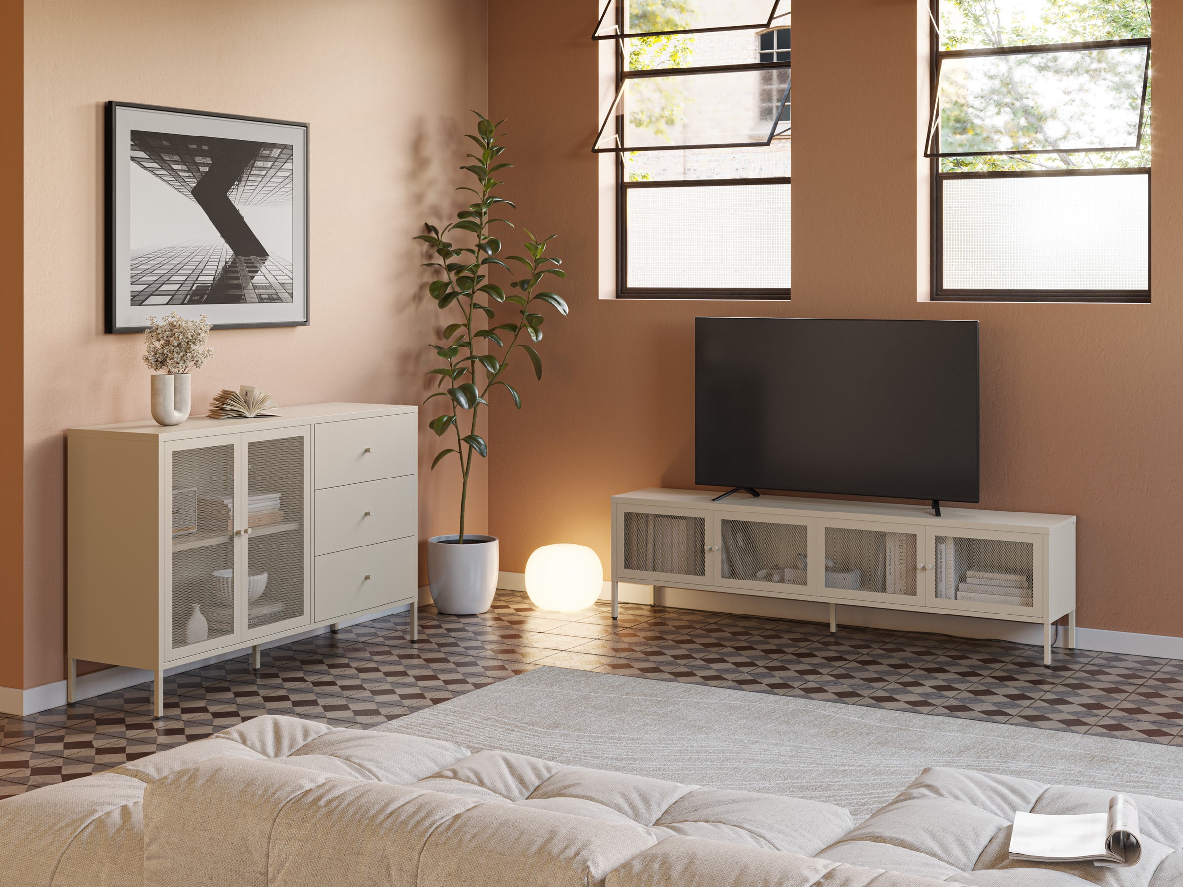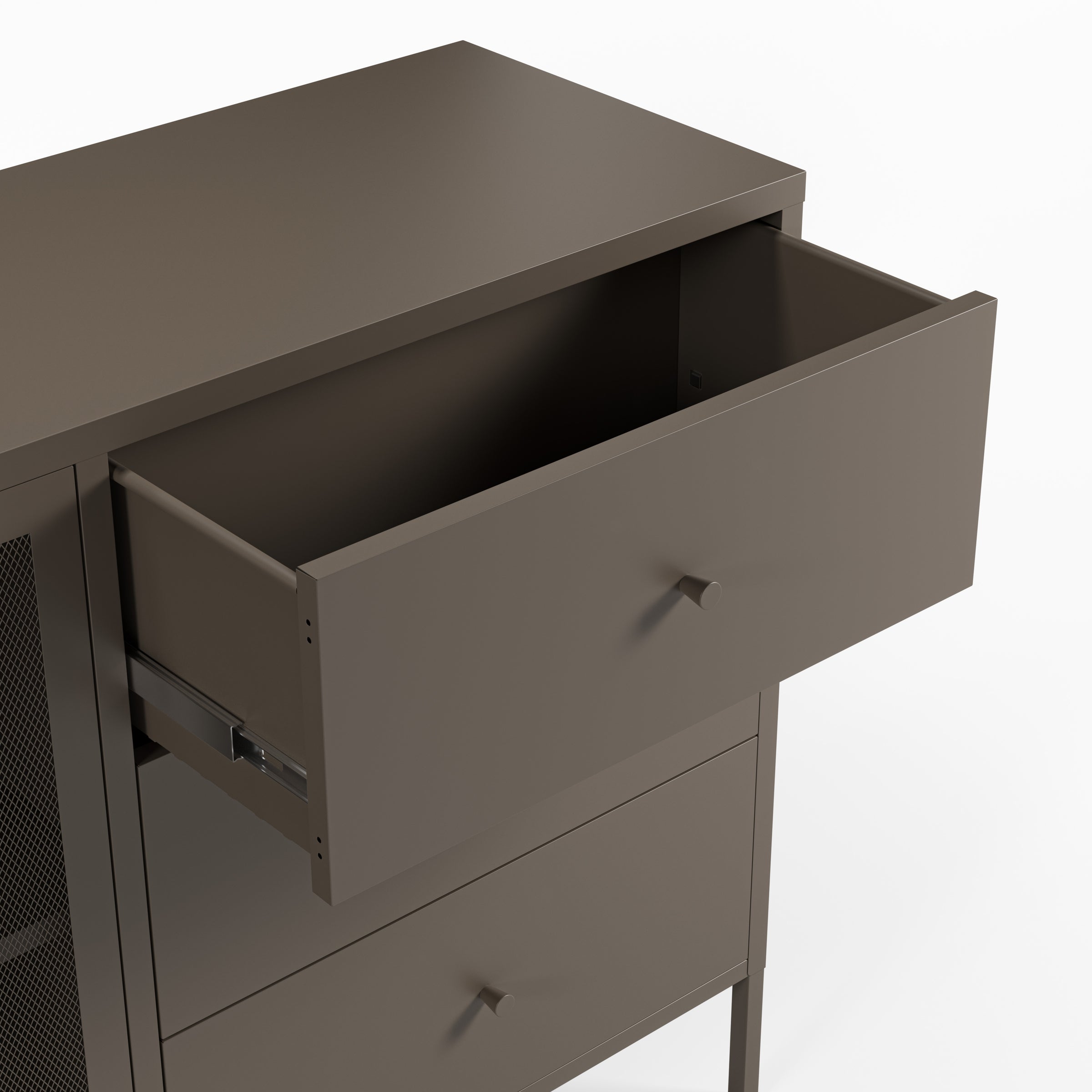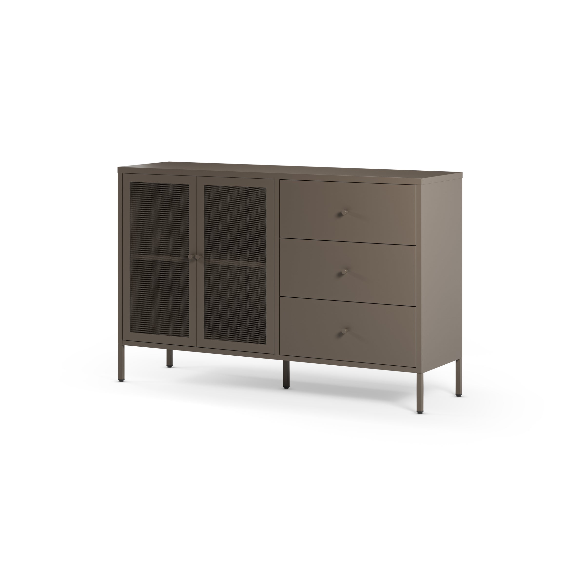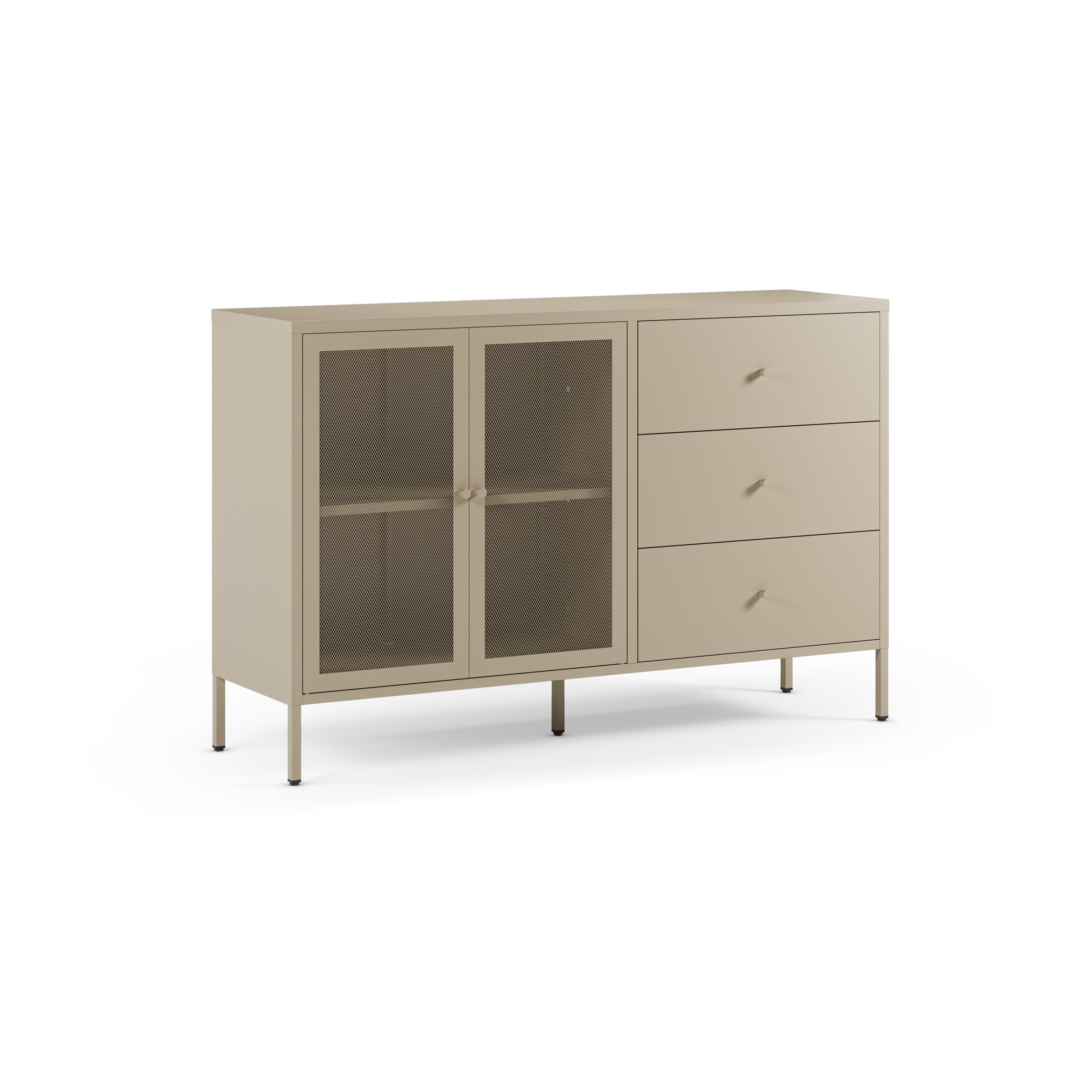 Aparador 2 puertas, con estructura de metal y 3 cajones. Puertas de rejilla tipo gallinero metálicas.