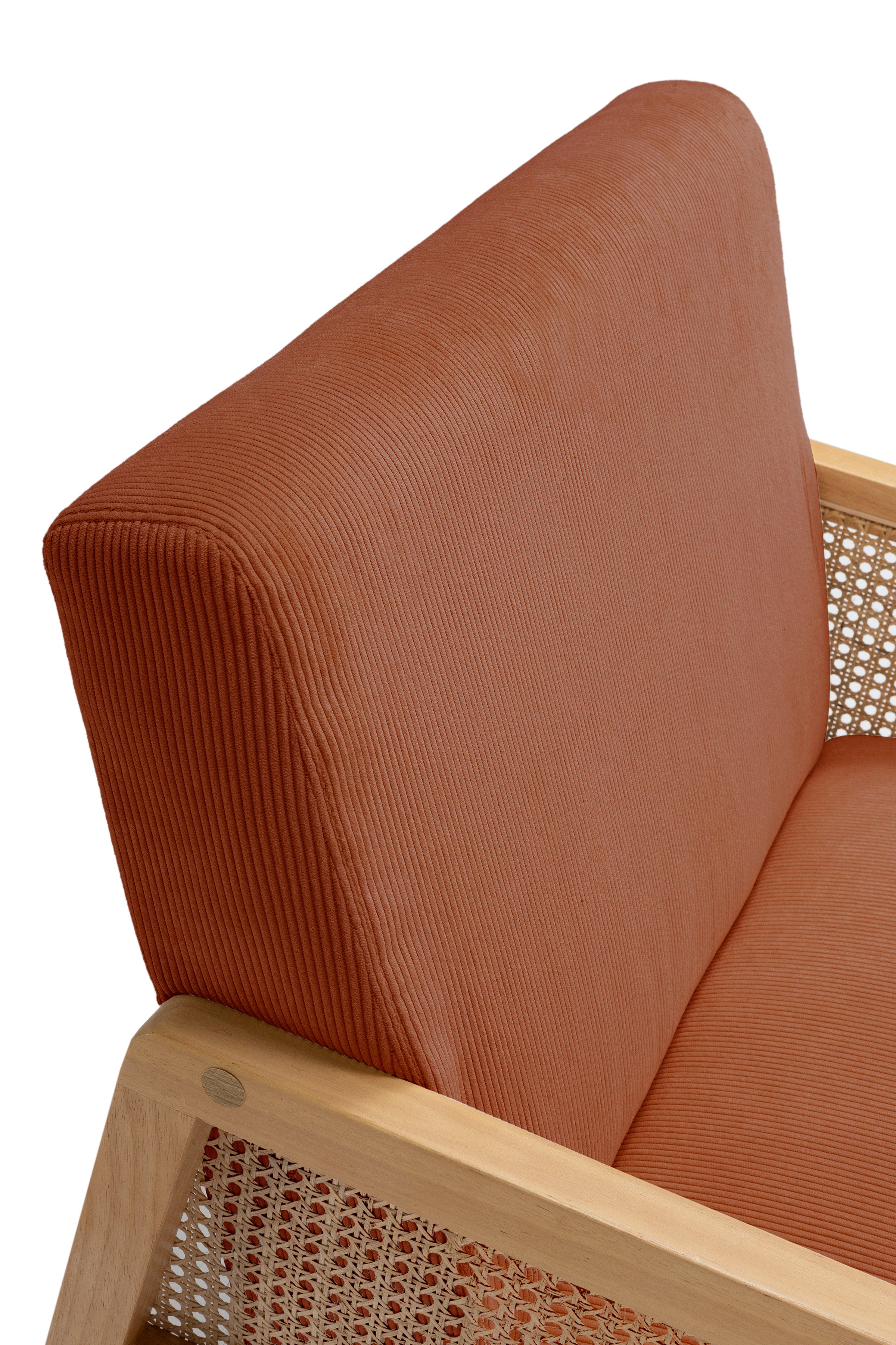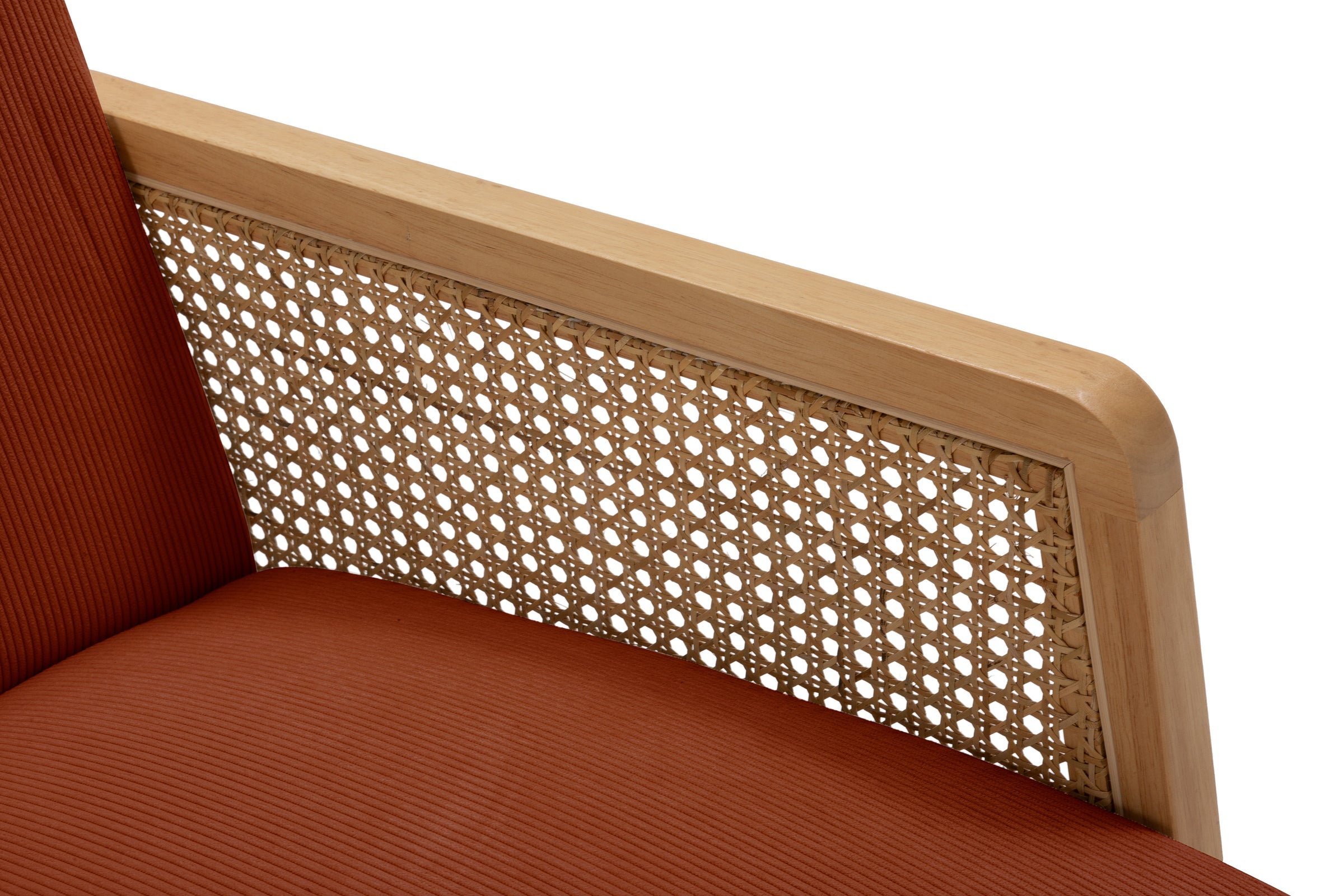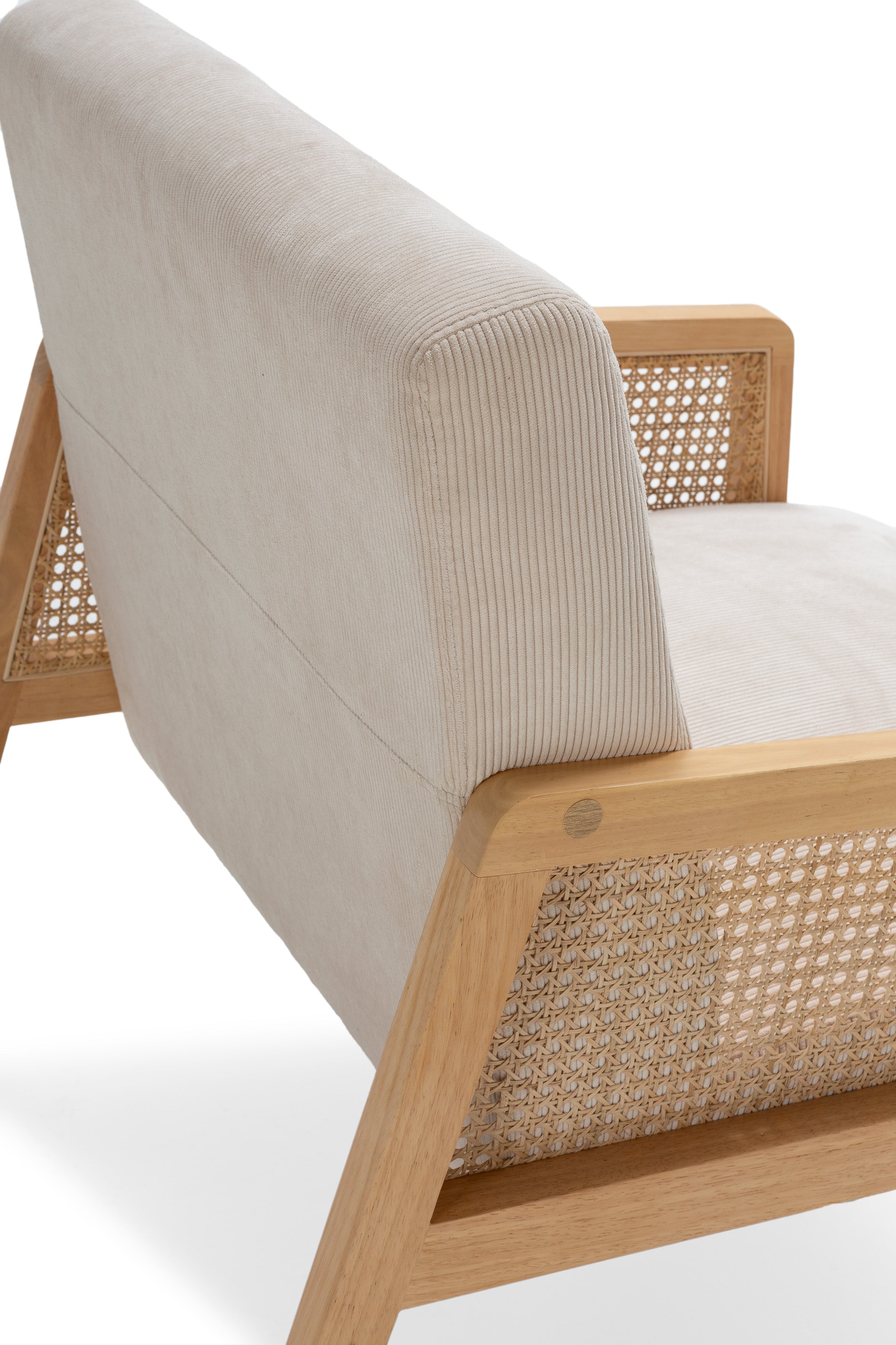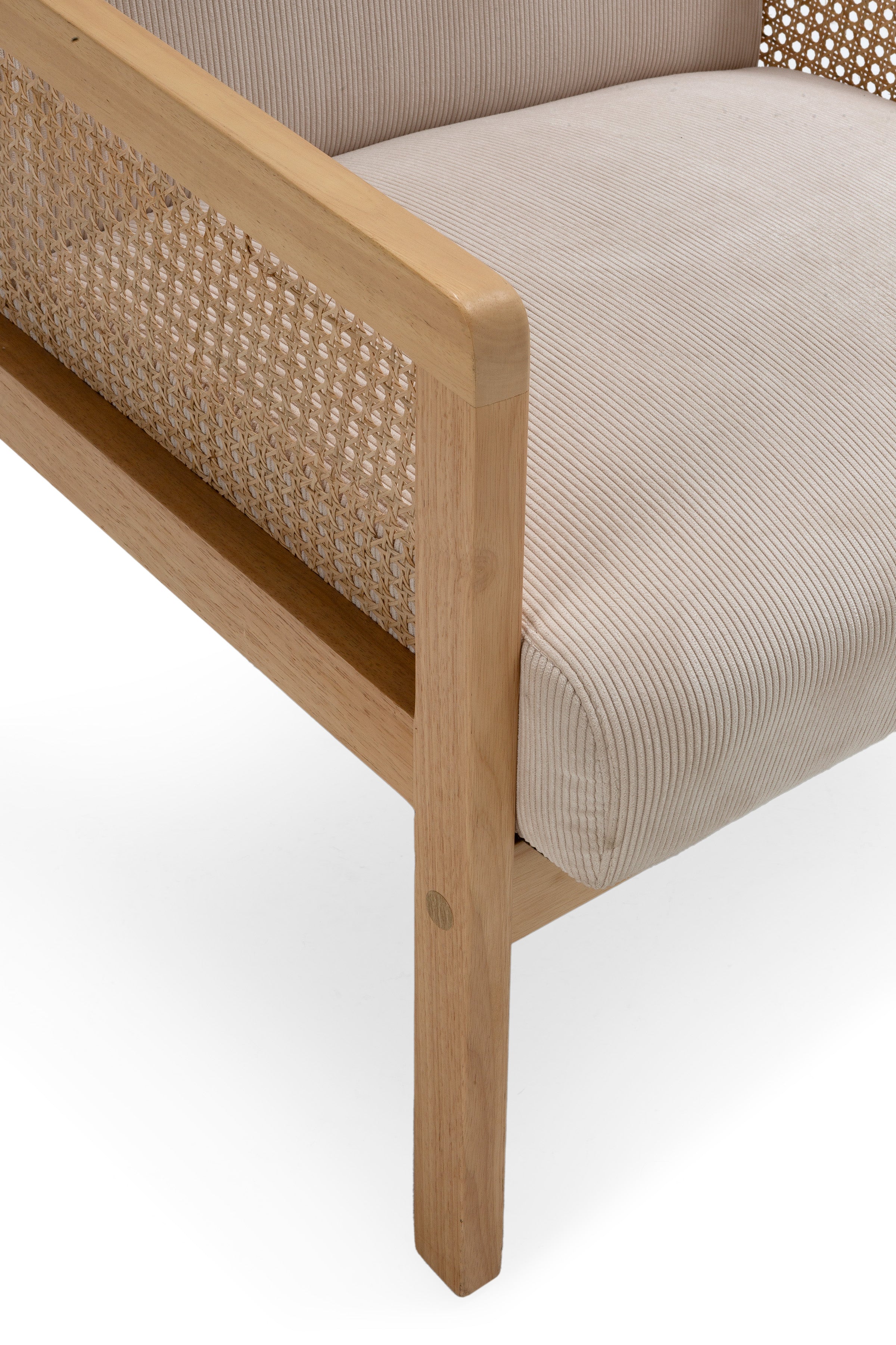 La butaca Panale combina elegancia y funcionalidad con su acabado tapizado en pana y sus brazos de madera en diseño tipo rejilla.