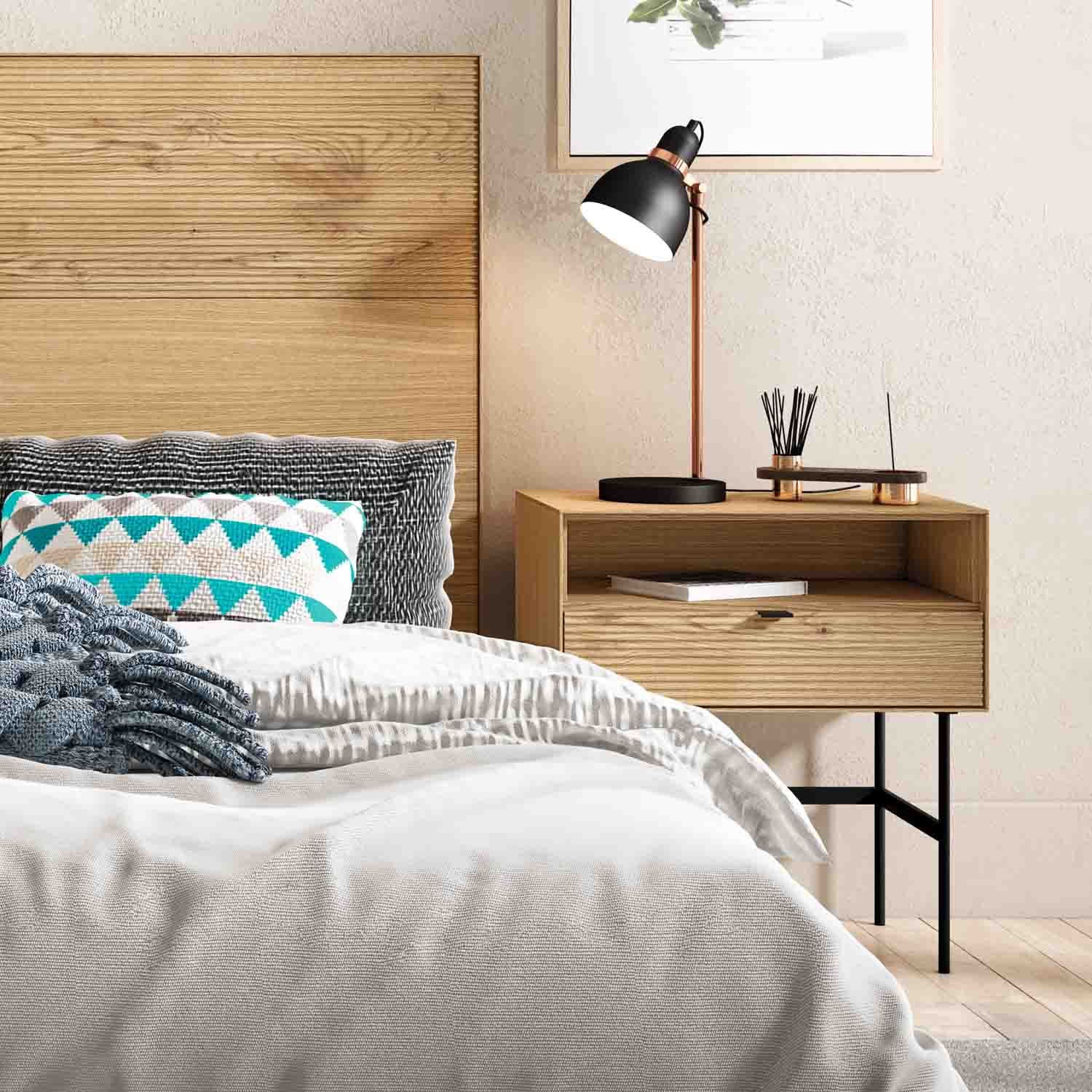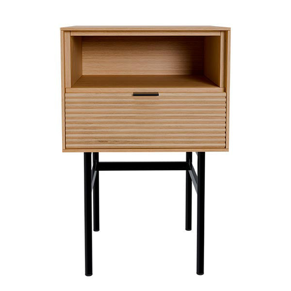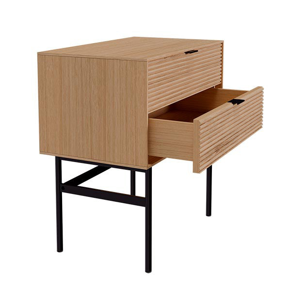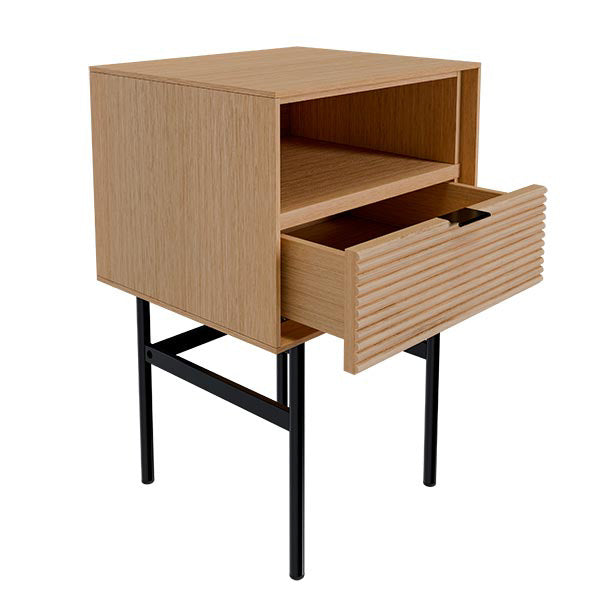 La mesita Melar destaca por su estructura en chapa de roble y frontales de madera maciza de roble rayado, combinados con chapa de roble natural en el resto de la pieza.