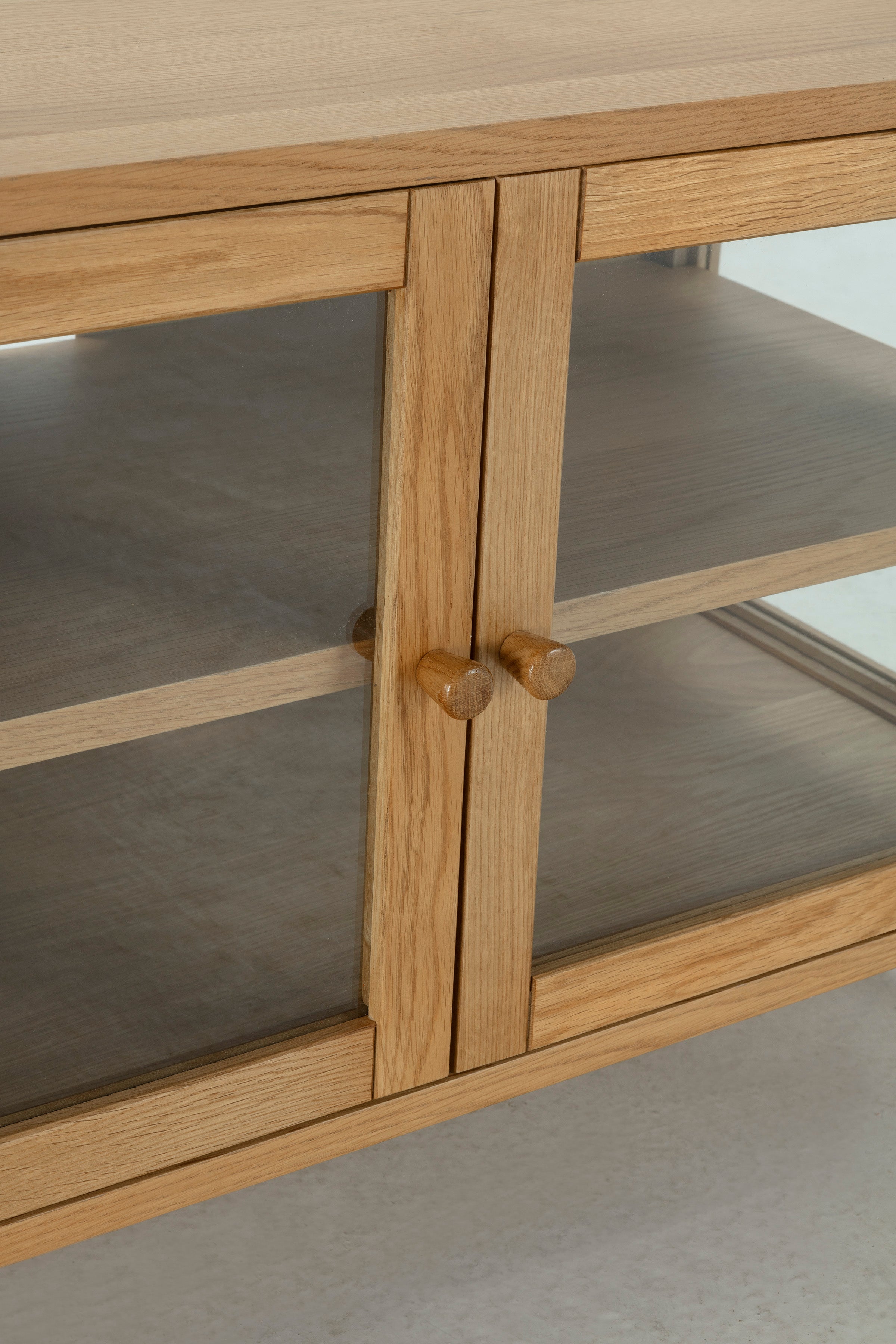 El mueble TV Arvia combina la calidez del roble con la elegancia del cristal y la resistencia del chapado MDF, ofreciendo una pieza robusta y sofisticada para tu sala.